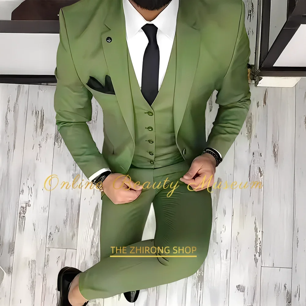 Costumes élégants pour hommes en vert olive, 3 pièces, veste à revers cr...