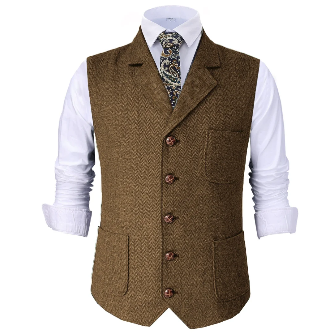 Nouveau Gilet Homme 2026 Marron à Motif Chevrons avec Revers pour Mariage, Banquet, Affaires,...