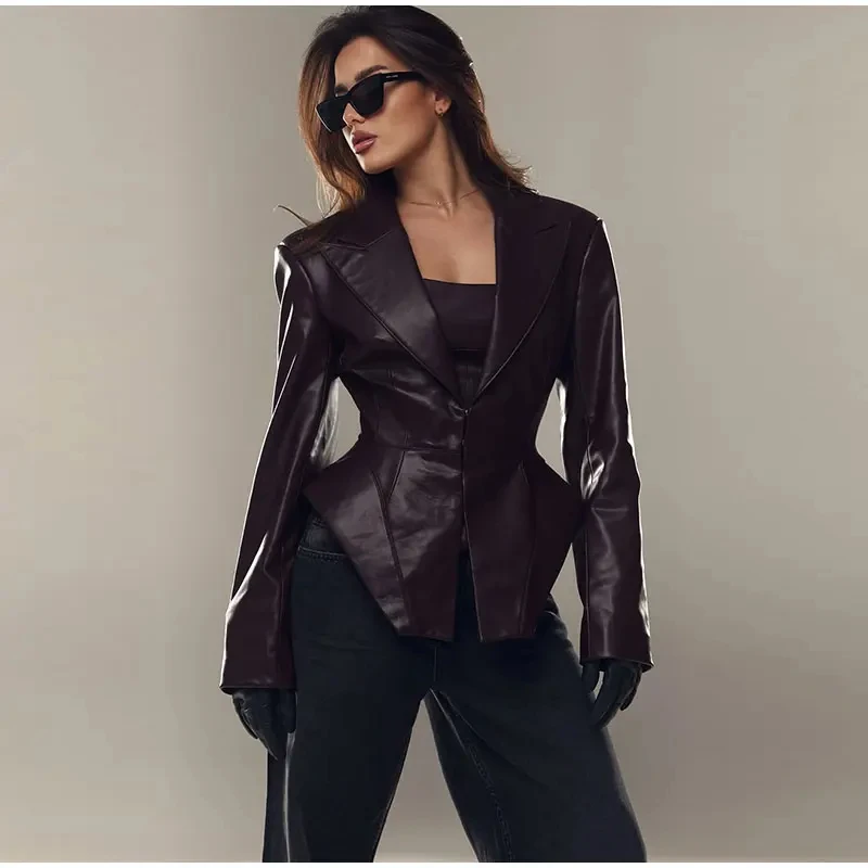 Veste en similicuir vintage pour femme BJTZ, ourlet asymétrique, coupe ajustée, &eacut...