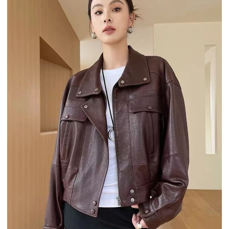 Veste en cuir véritable pour femme, col montant haut, manteau court rétro en peau de m...