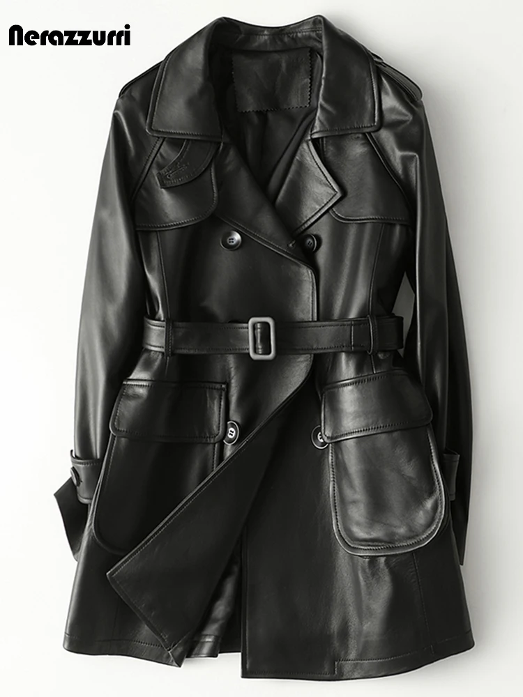 Nerazzurri Veste en cuir noir pour femme, manches Leurs lan, ceinture, double boutonnage, simili cui...