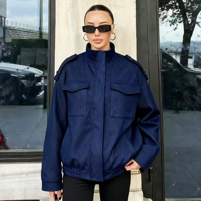 Veste en daim bleue pour femme à manches longues, style simili cuir, veste demi-saison pour f...