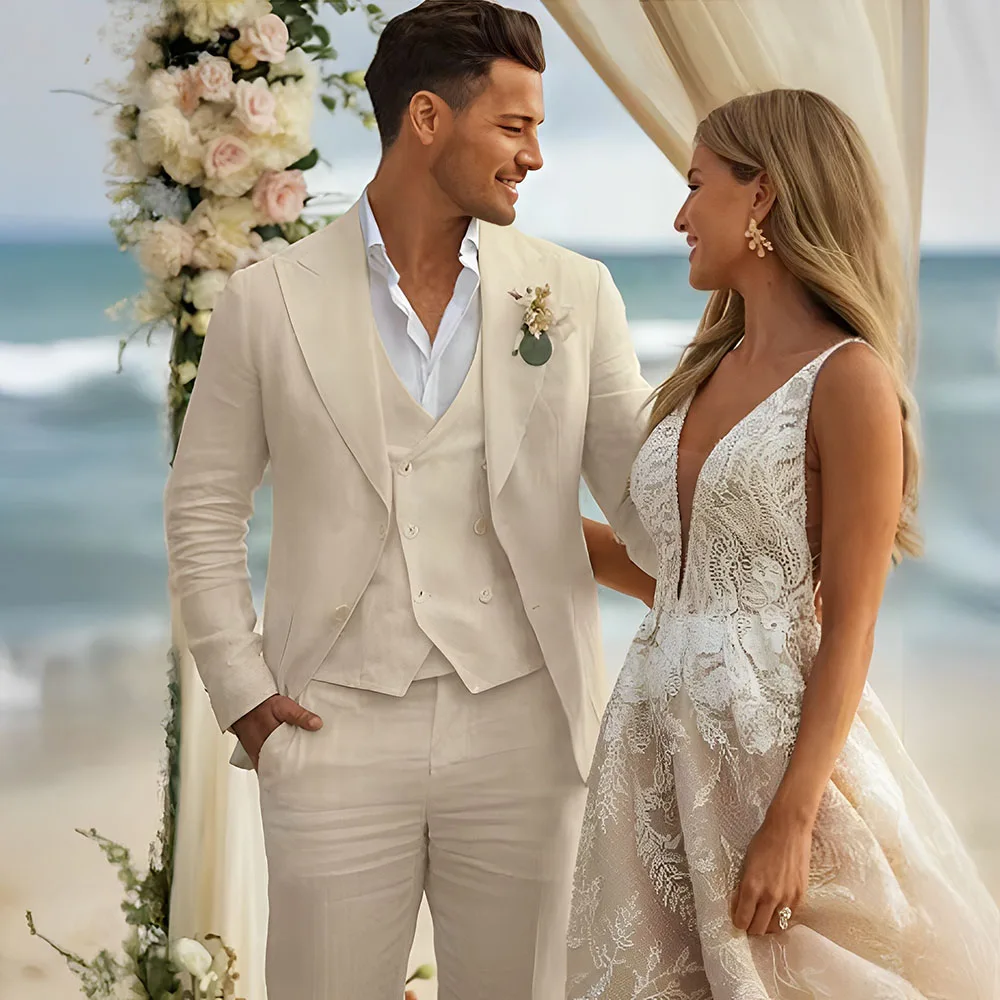 Costume en lin Beige pour hommes, smoking de mariage d'été, tenue de fête 3 pi&e...