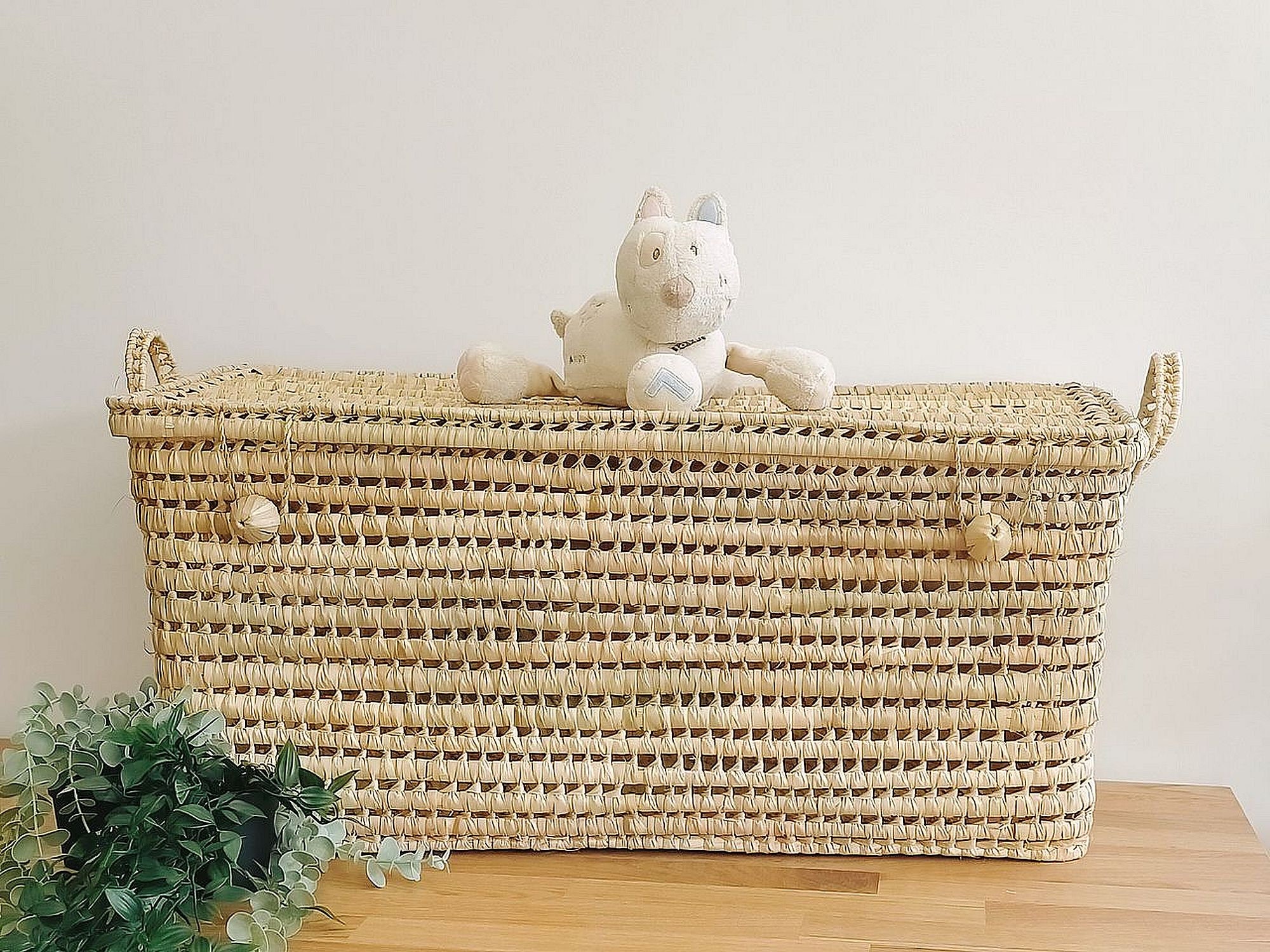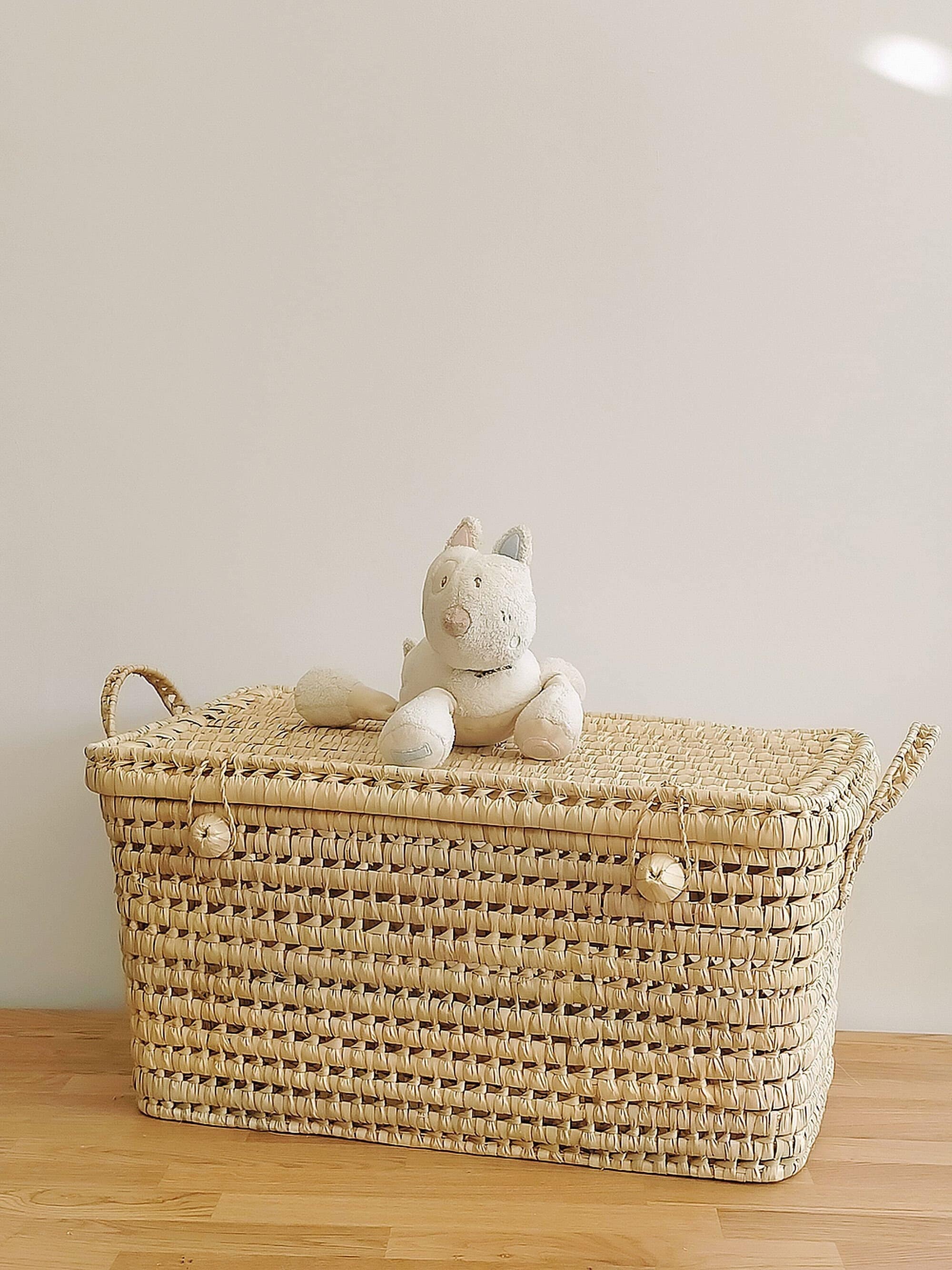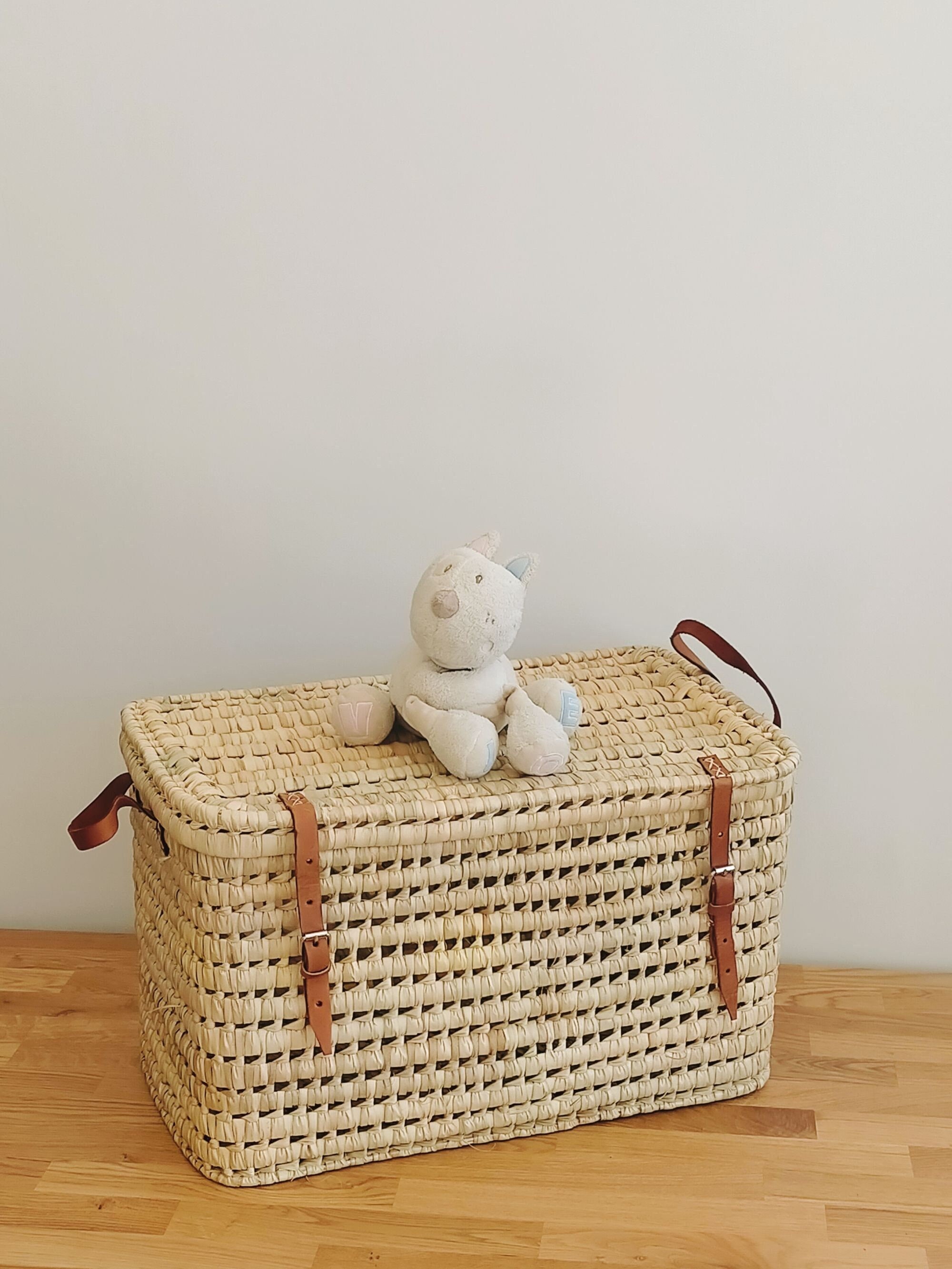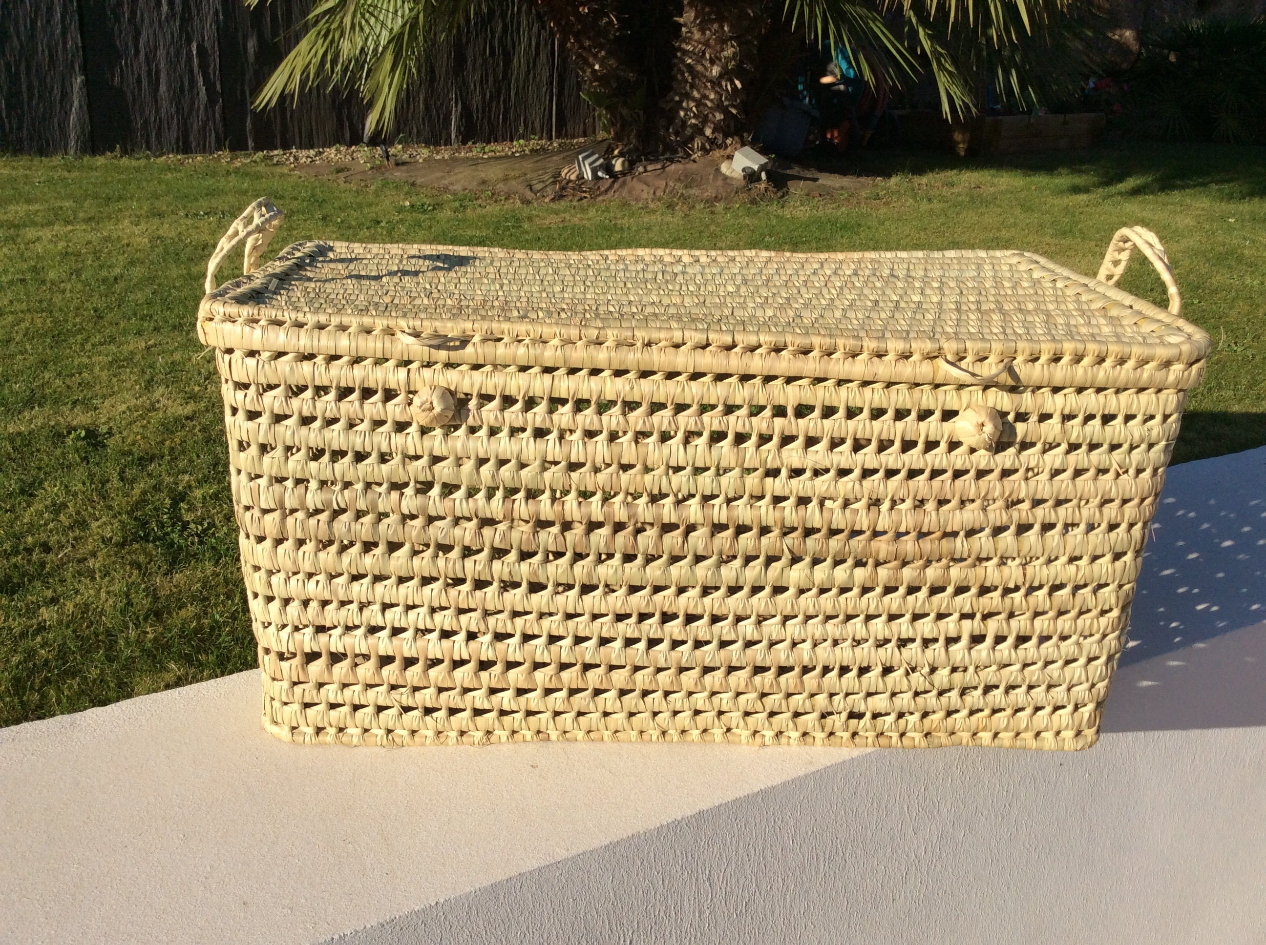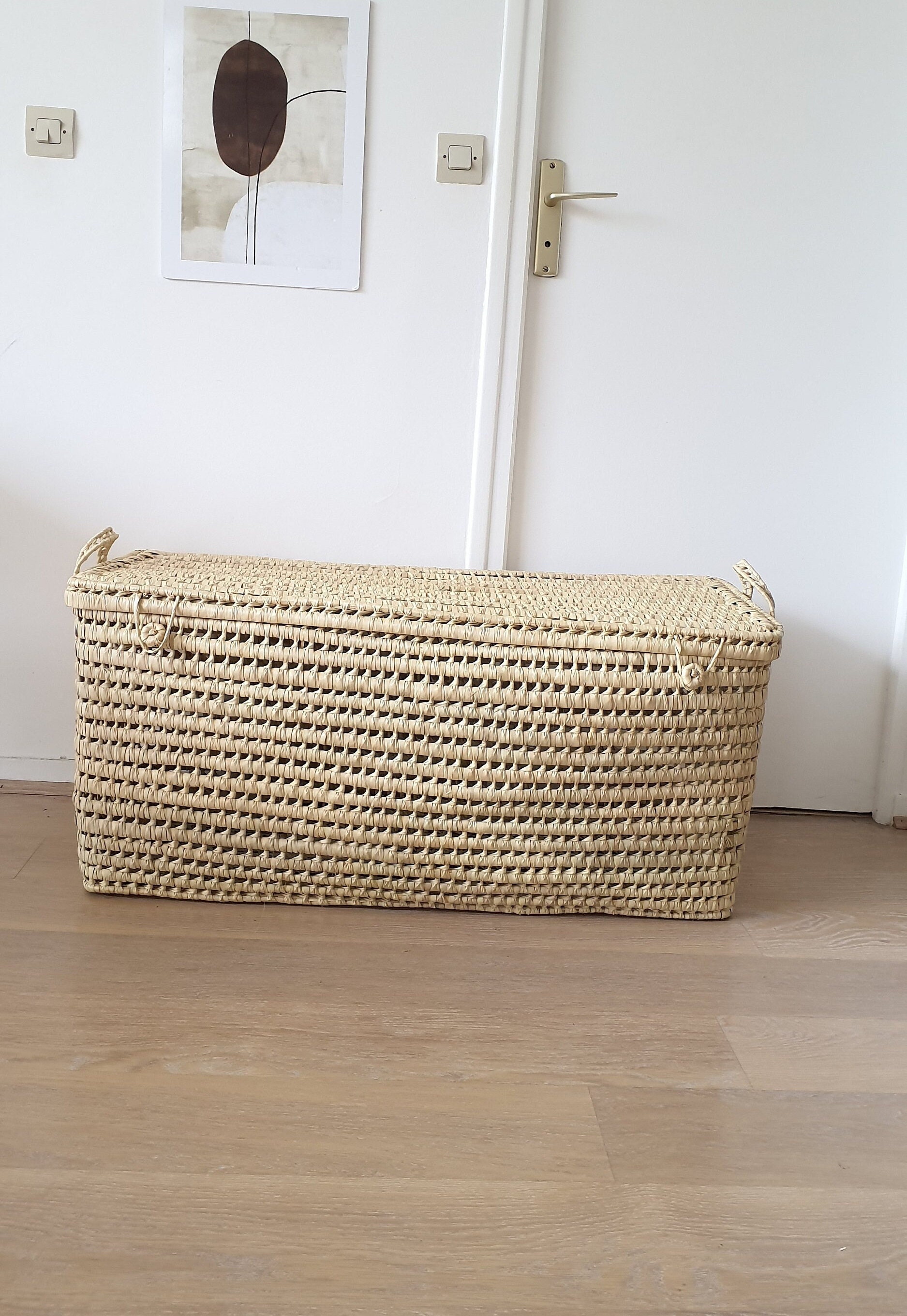 Magnifique malle à jouets, coffre de rangement. Coffre en feuille de palmier fait à la...