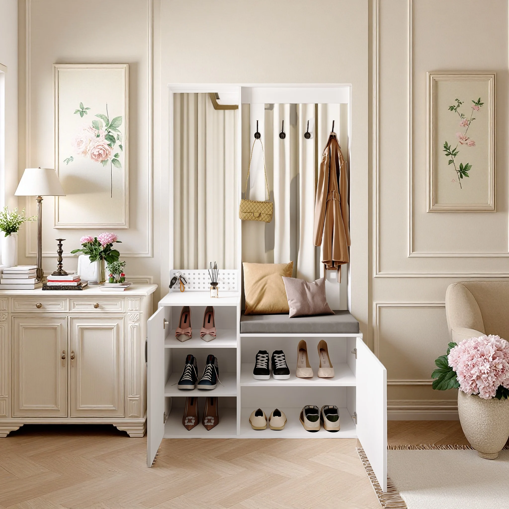 Meuble d'entrée moderne avec crochets et miroir, meuble à chaussures avec banc et cous...