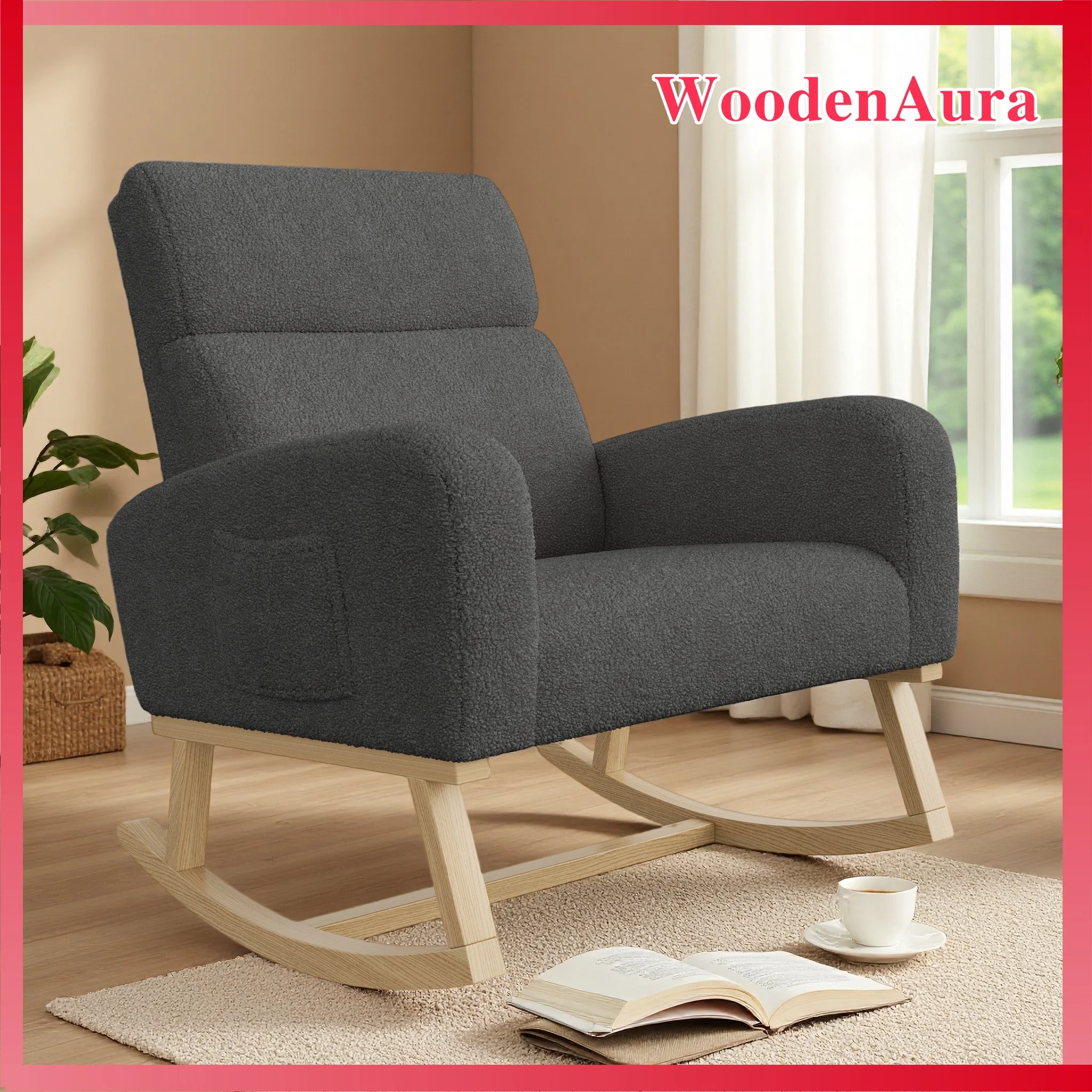 WOODENAURA Chaise à bascule de salon, chaise longue en peluche Teddy, fauteuil avec poches la...