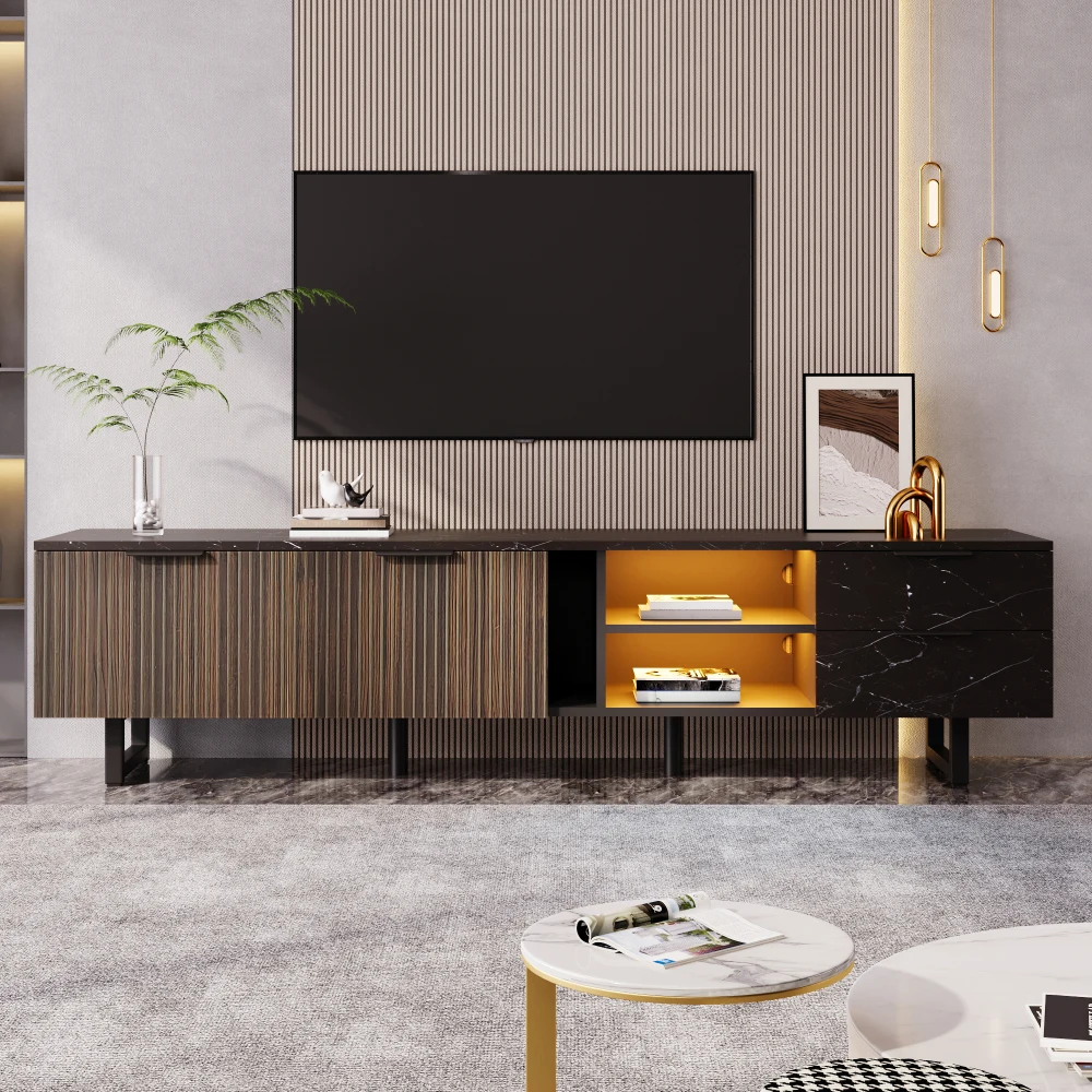 Anajqaqia Meuble TV 200 cm aspect marbre noir, portes en grain de bois foncé, éclairag...