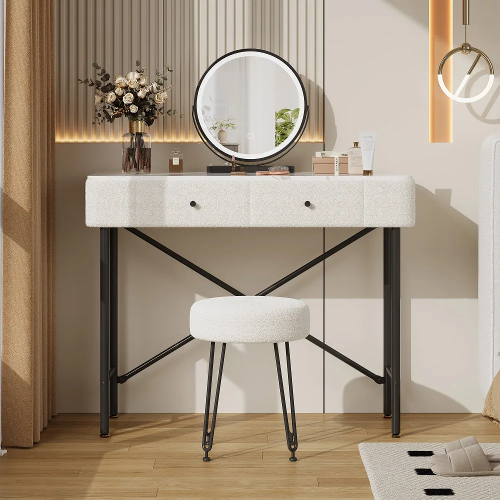 PINGGO Table de maquillage noire et blanche avec miroir LED, tabouret, 2 tiroirs, dessus en marbre, ...
