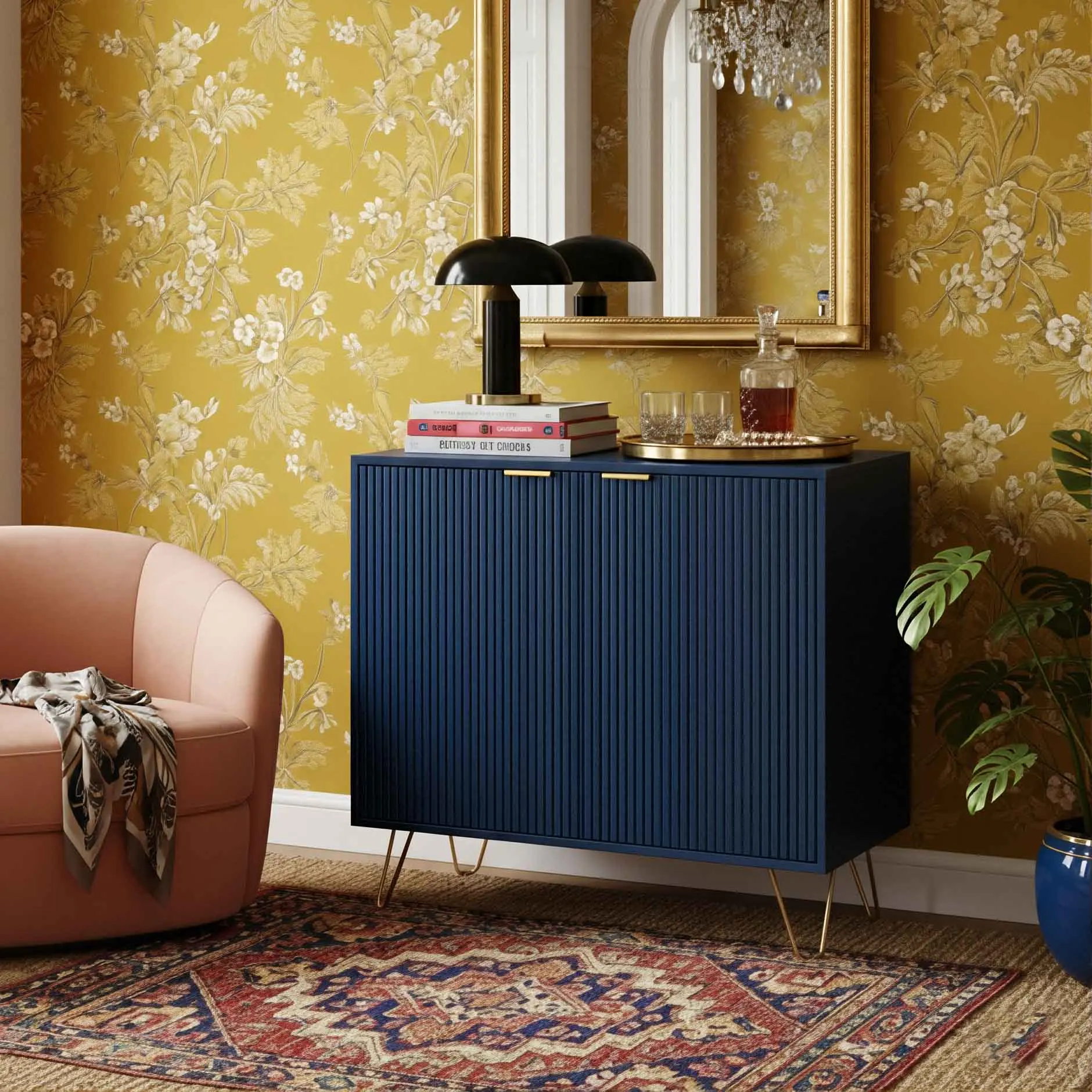 Buffet Bleu 80cm Meuble de Rangement 2 Portes Cannelées, Pieds en Métal Doré, &...