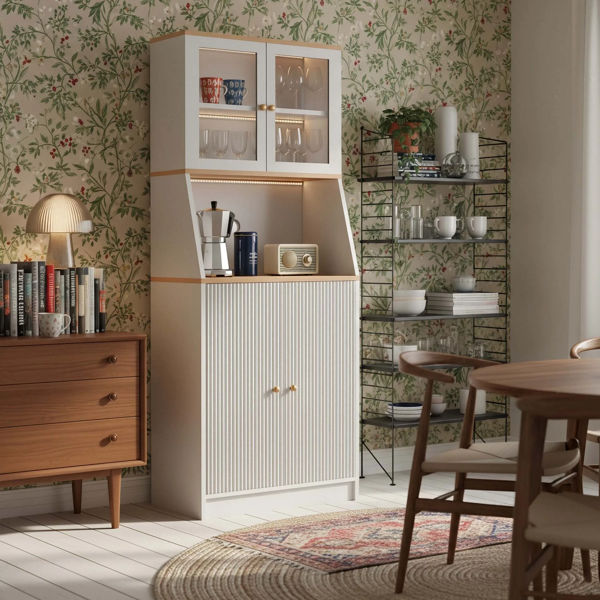 Buffet de Cuisine Haut 180cm Blanc et Bois, Armoire de Rangement av...