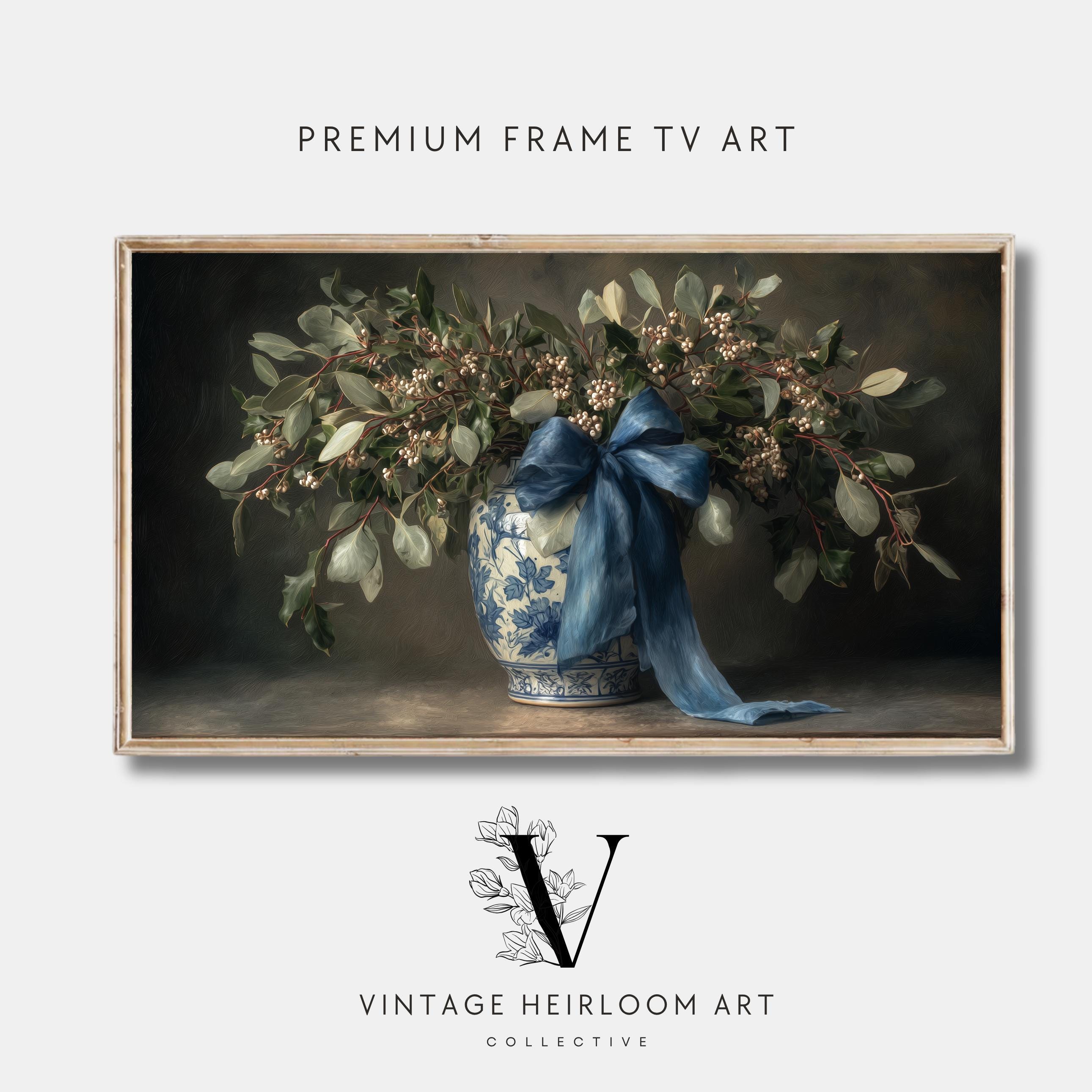 Chinoiserie Noël ruban Vase cadre TV Art, peinture botanique d'hiver, vintage nature morte gui ...