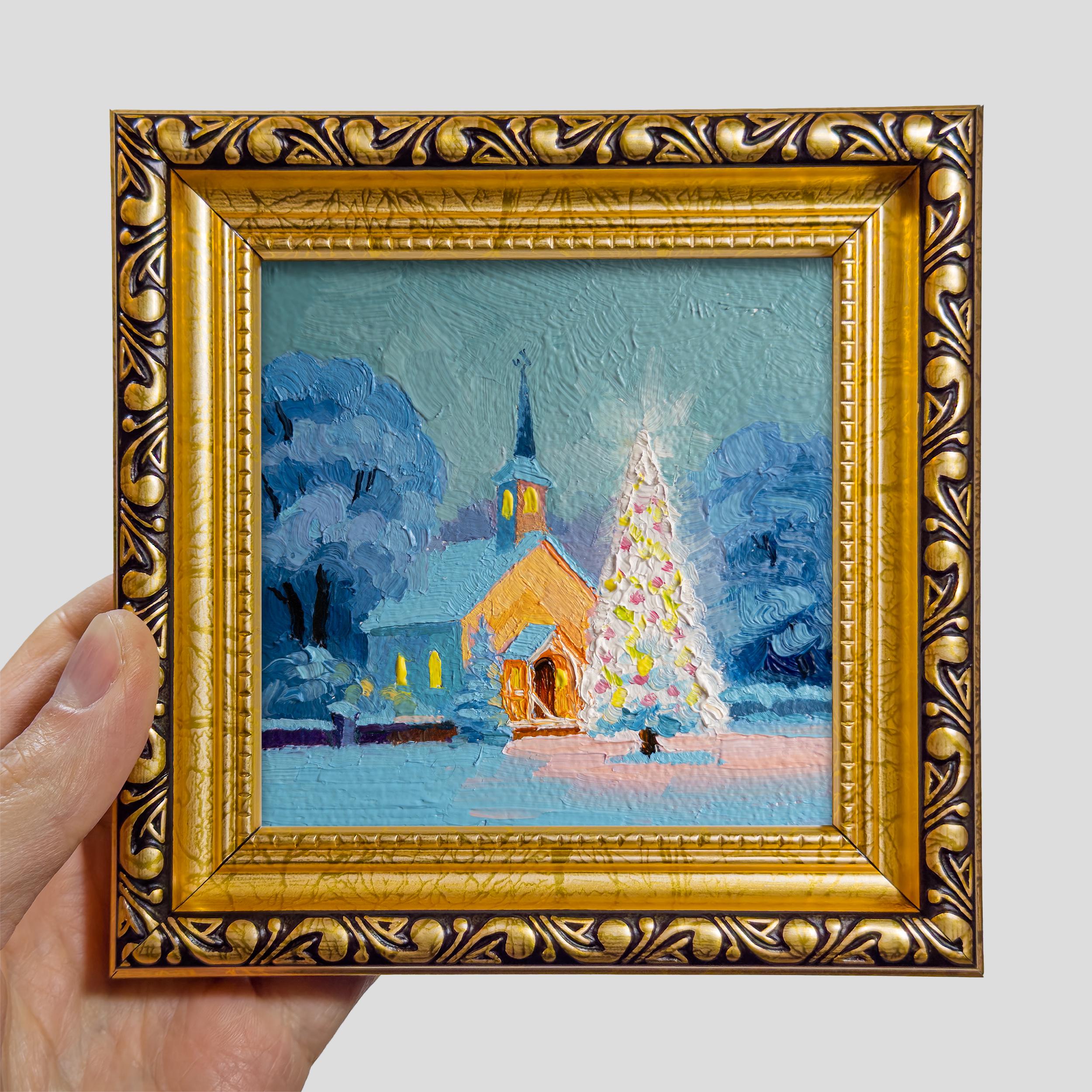 Peinture à l'huile miniature église de Noël enca...