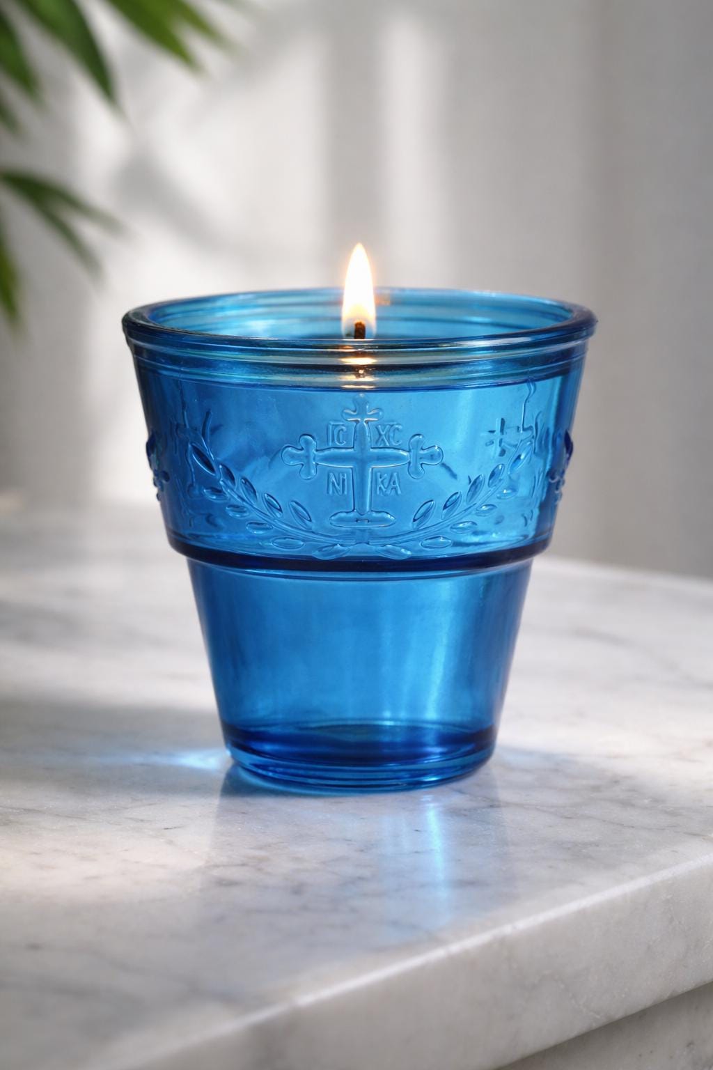 Lampe à huile de vigile en verre bleu : bougie à huile orthodoxe pour icônes Cad...