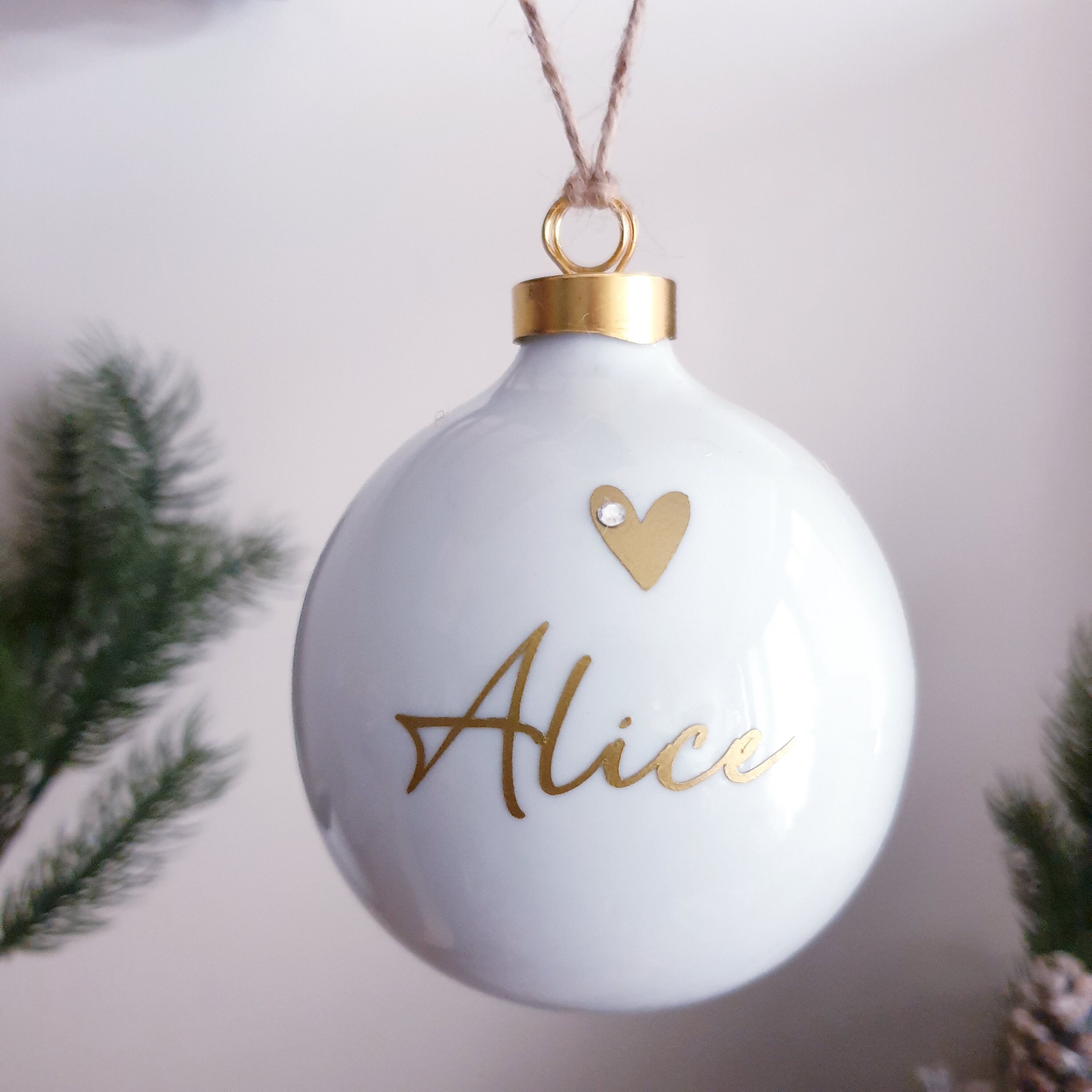 Grande boule de Noël personnalisée en porcelaine blanche et or - Un Cadeau souvenir uniq...
