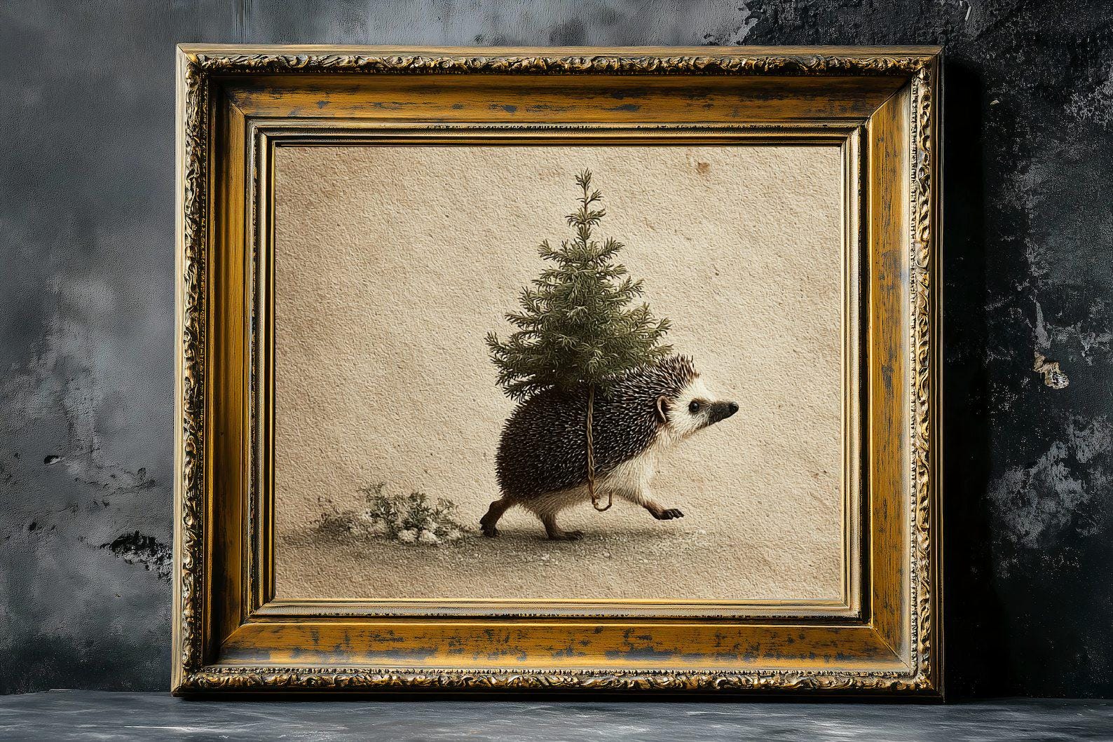 Hérisson vintage portant une impression d'arbre de Noël, art de Noël de mauvaise hu...