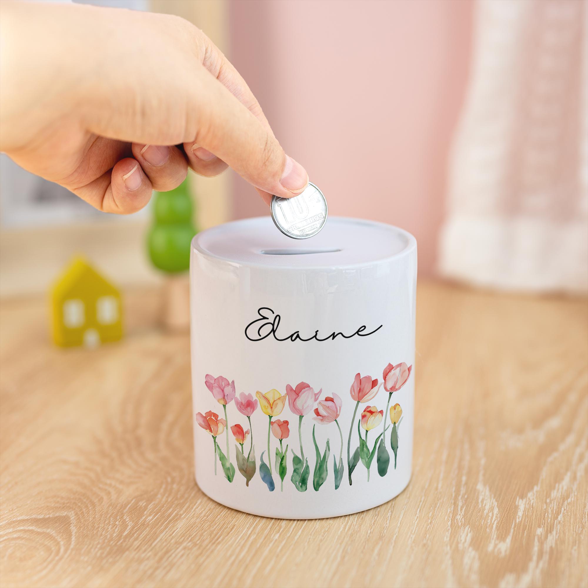 Tirelire personnalisée avec nom et fleur en céramique, tirelire en céramique, t...