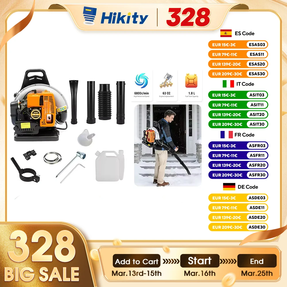 Souffleur à feuilles à dos Hikity 63CC, à essence, avec réservoir de 1,8...