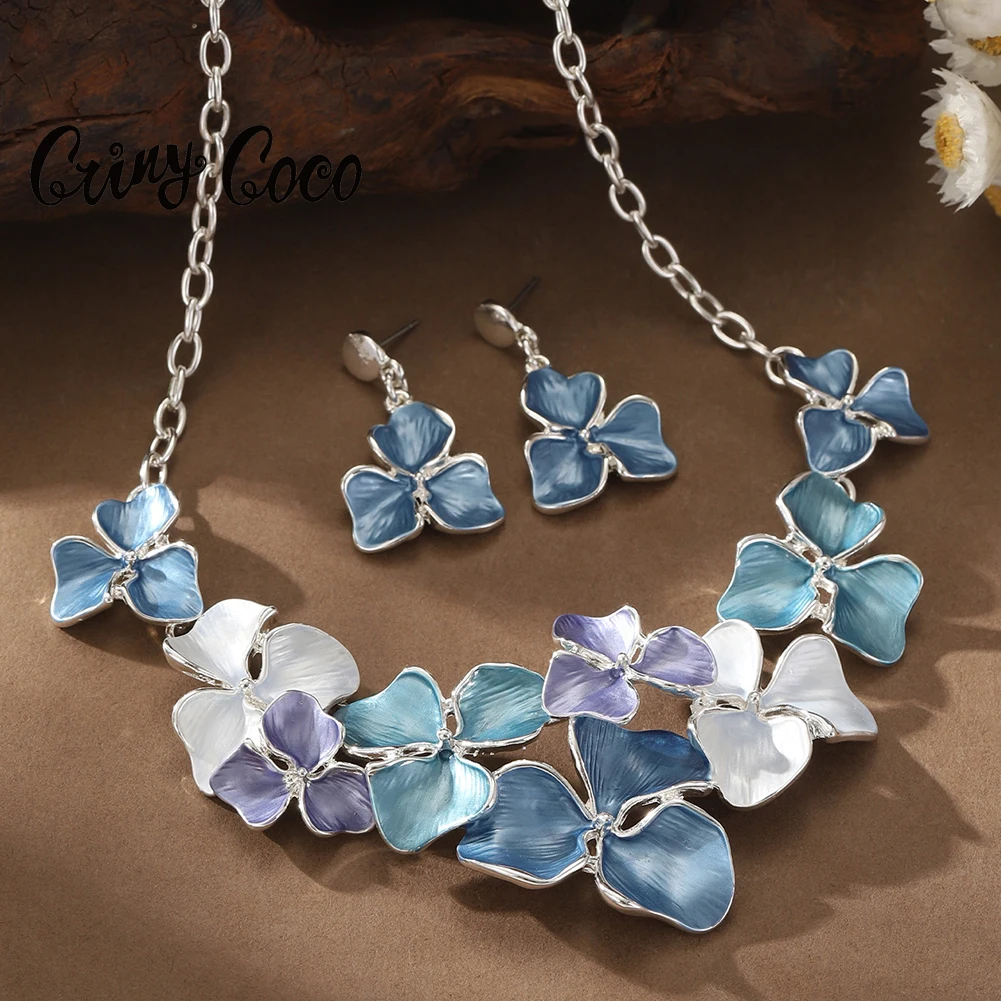 Cring Coco émail grande fleur bleue ensemble de bijoux mode populaire bijoux collier ensemble...