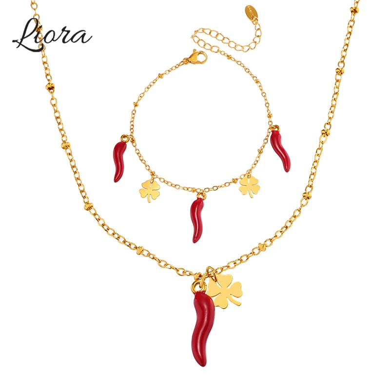 Liora nouveau trèfle porte-bonheur poivre rouge pendentif collier Bracelet pour femmes en aci...