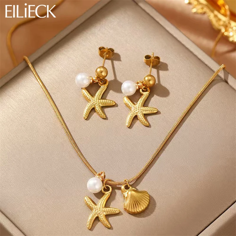 EILIECK 316L acier inoxydable étoile de mer perle coquille pendentif collier boucles d'oreill...