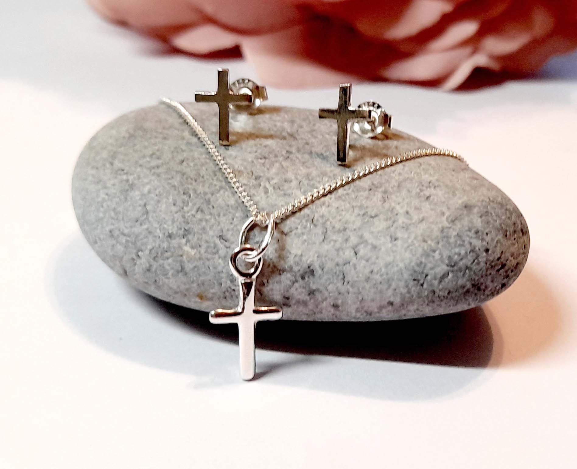 Ensemble cadeau collier croix et clous d'oreilles en argent sterlin...