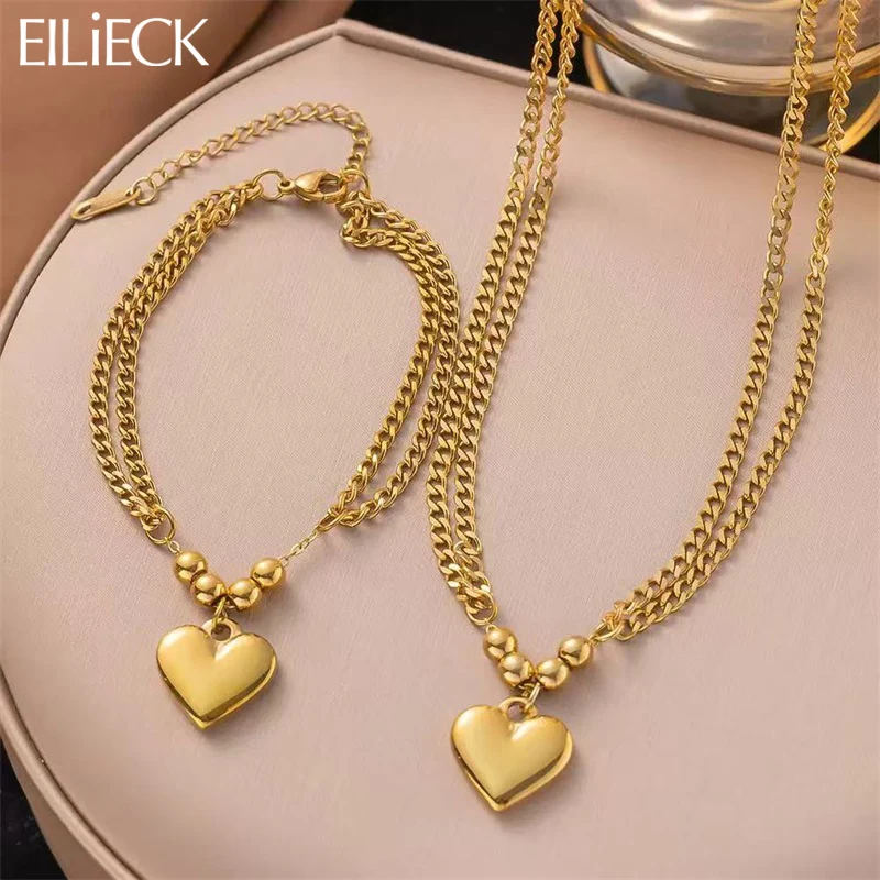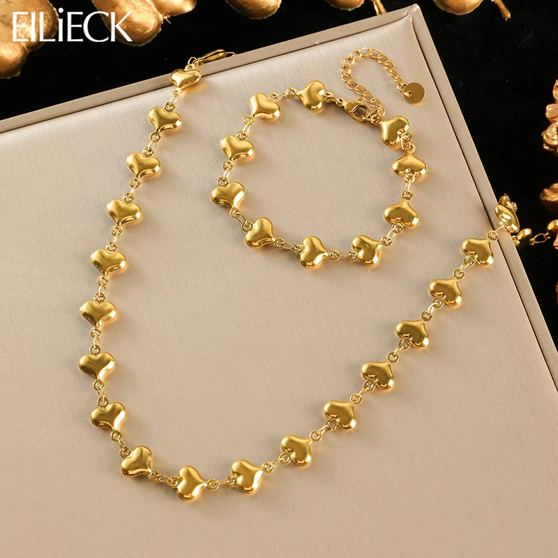 EILIECK 316L acier inoxydable couleur or lisse coeur breloque collier Bracelets ensemble pour les fe...