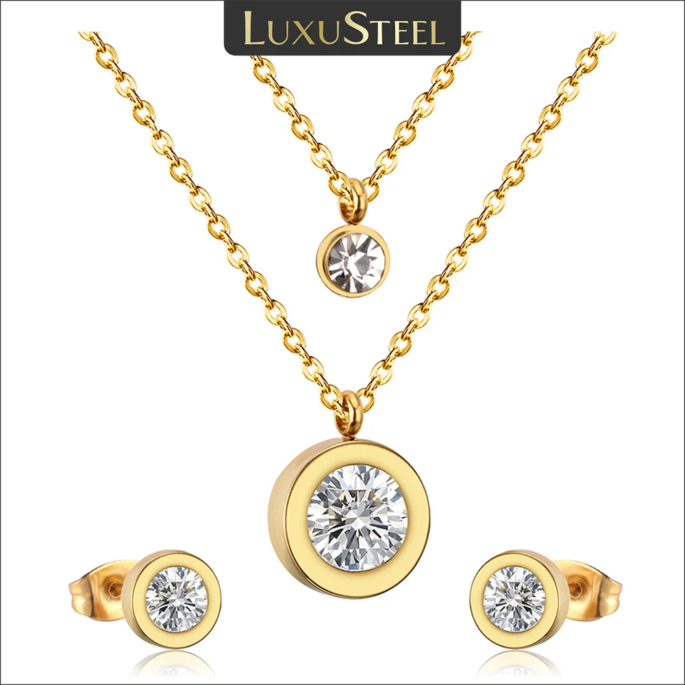 Ensembles de Bijoux de luxe en zircone cubique, en acier inoxydable, pendentif Double rond, collier ...
