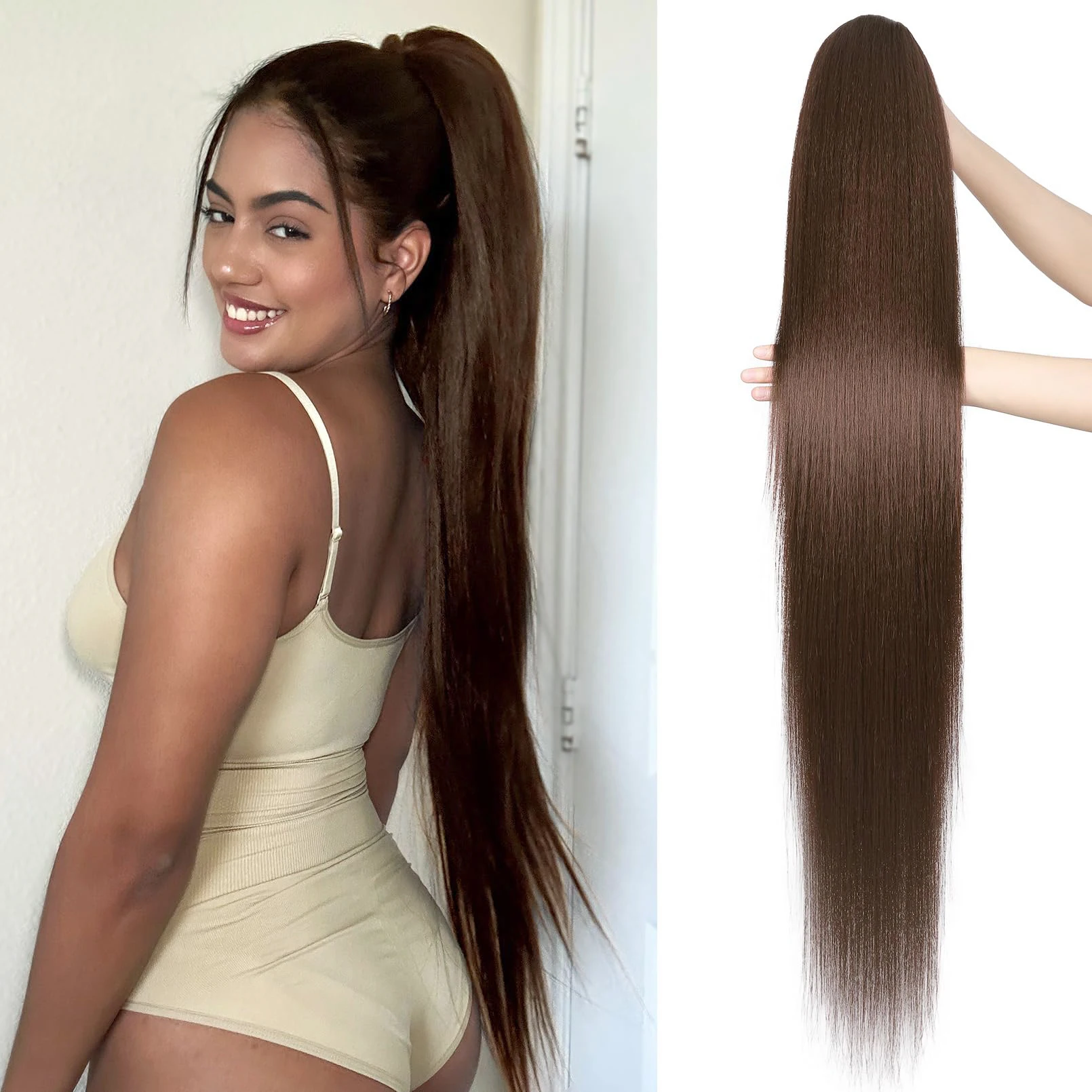 # Queue de cheval droite mi-longue marron avec cordon de serrage, postiche à clipser, extensi...