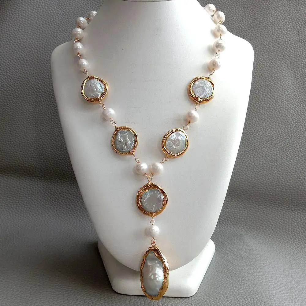 KKGEM-Pièce ronde remplie d'or, collier rond, eau douce, blanc naturel, 22x24mm