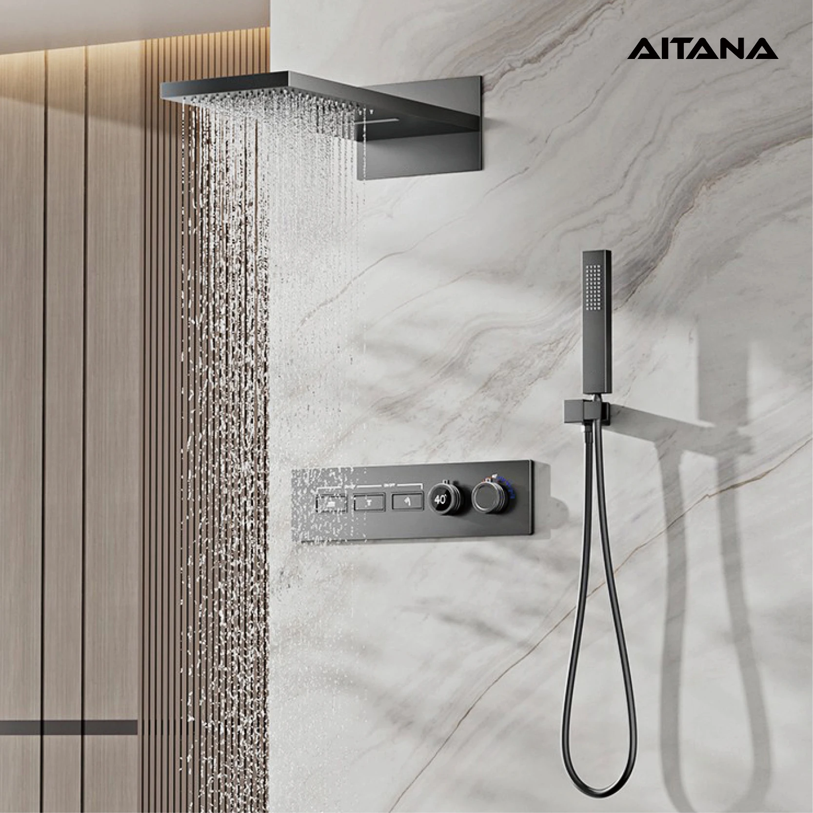 Système de douche mural gris pistolet en laiton de luxe, conception murale avec affichage num...