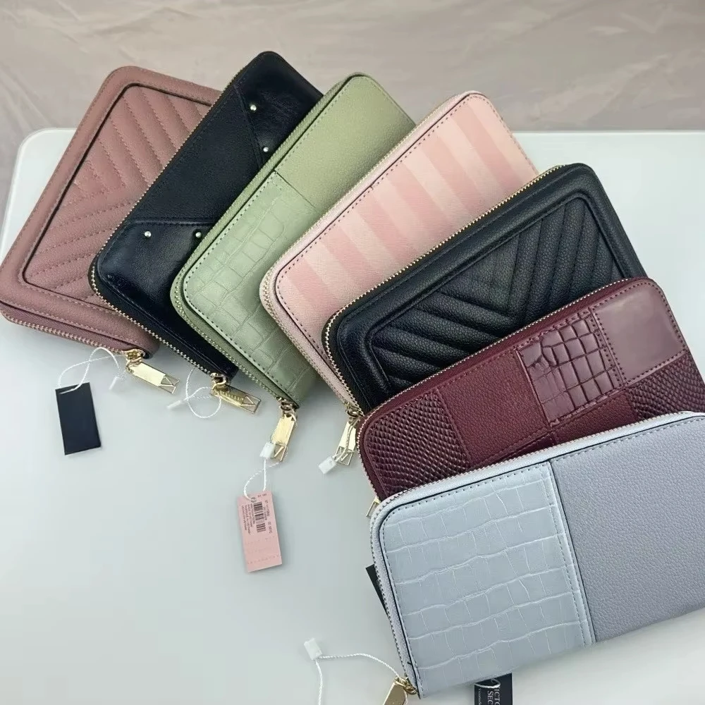 Porte-cartes long en cuir grainé avec fermeture éclair et pince à billets