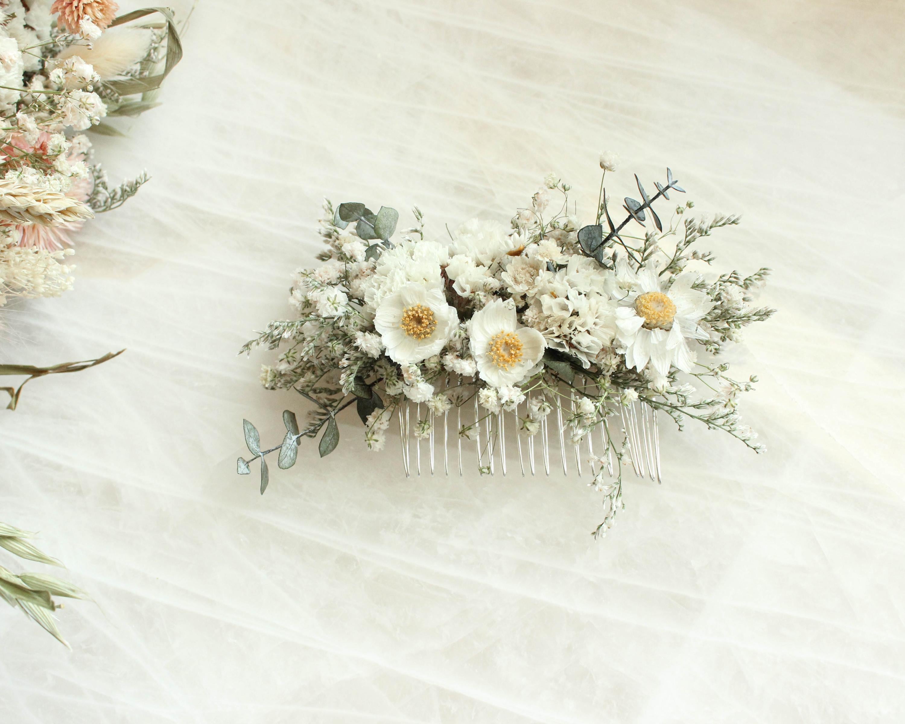 Peigne à cheveux avec marguerite blanche et eucalyptus / Fleurs séchées naturel...