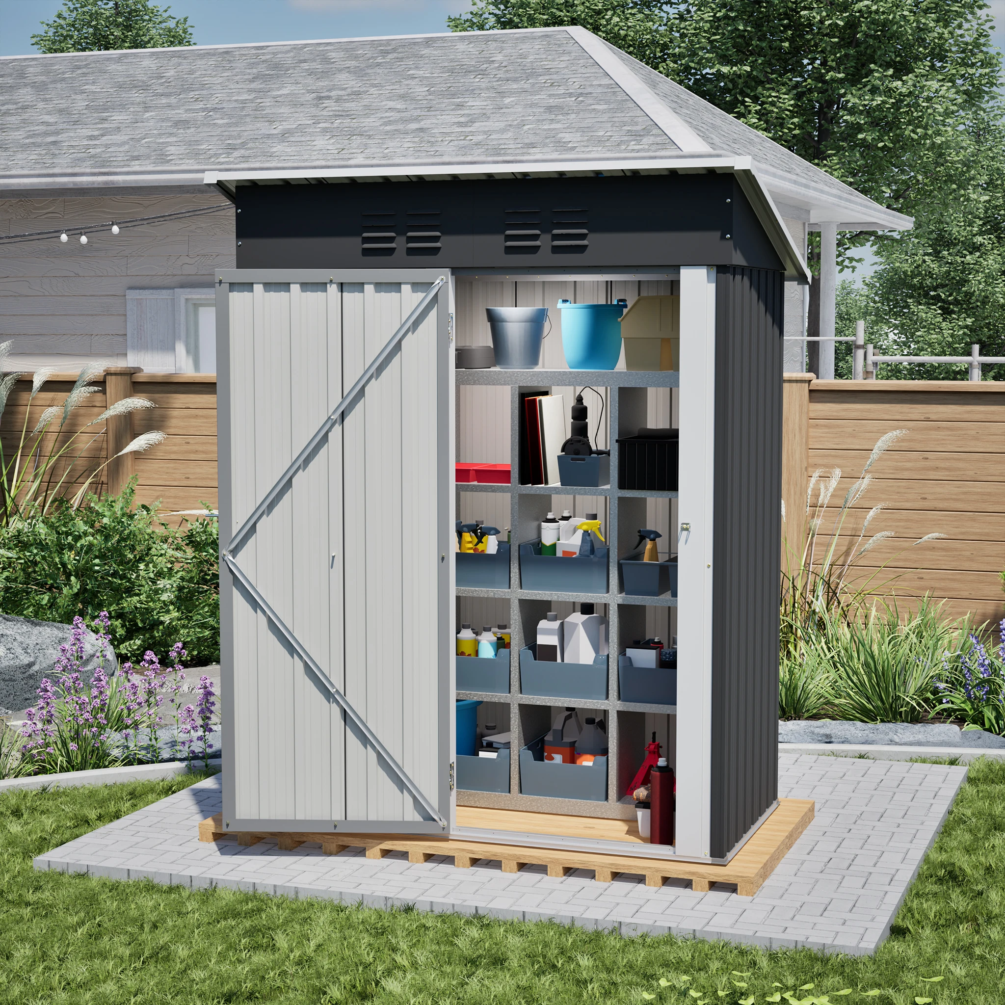 Abri à outils de jardin 152x84x182 cm, toit plat, porte métallique verrouillable, desi...