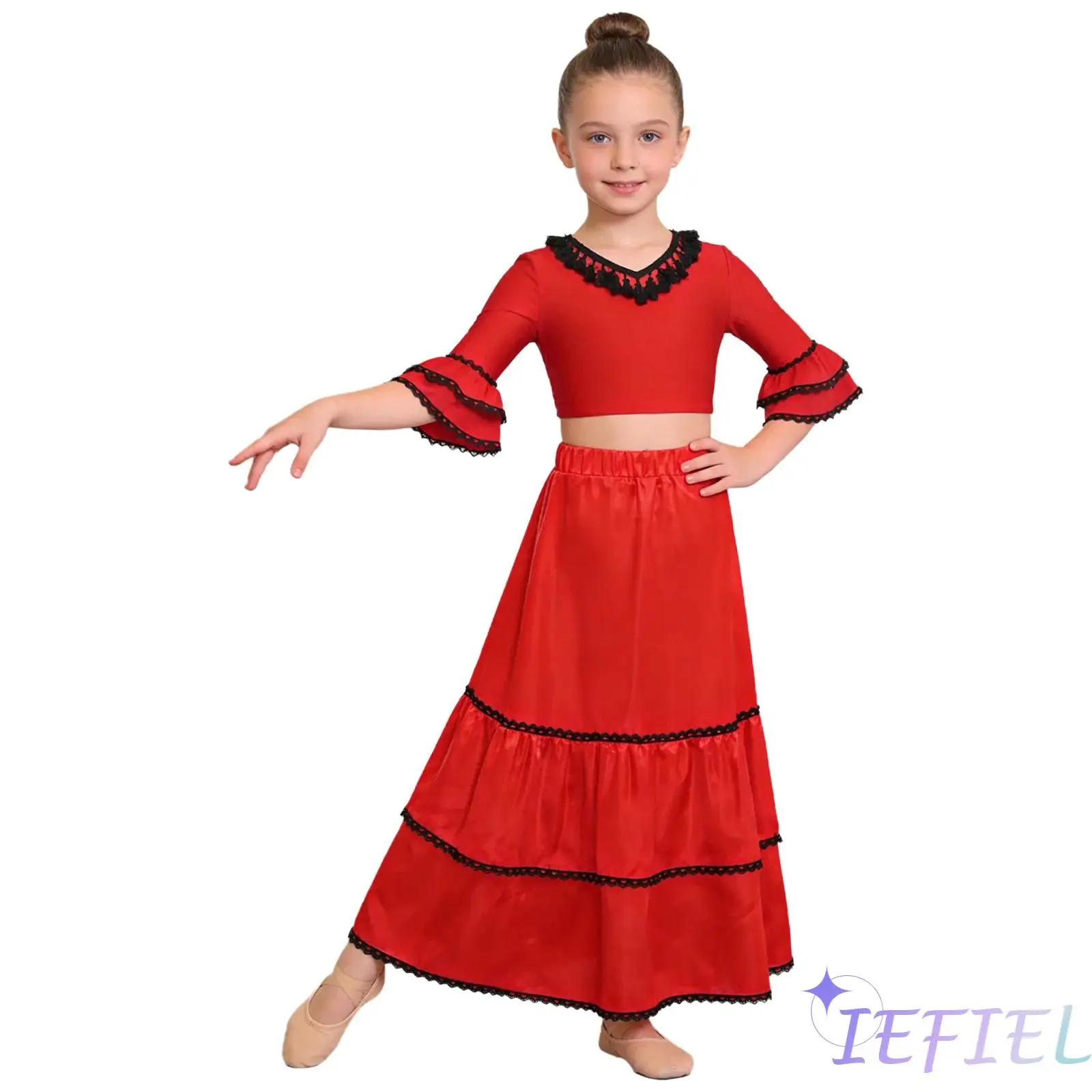 Vêtements de danse flamenco espagnol pour enfants filles, haut court à col en v et manc...