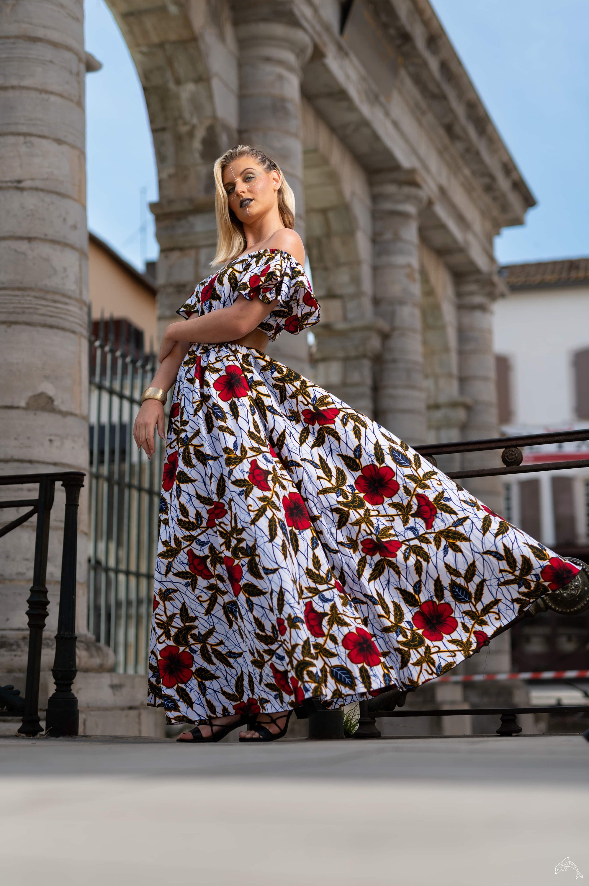 Maxi robe blanche en wax fleur d'hibiscus- Floral Wax Cotton Maxi D...