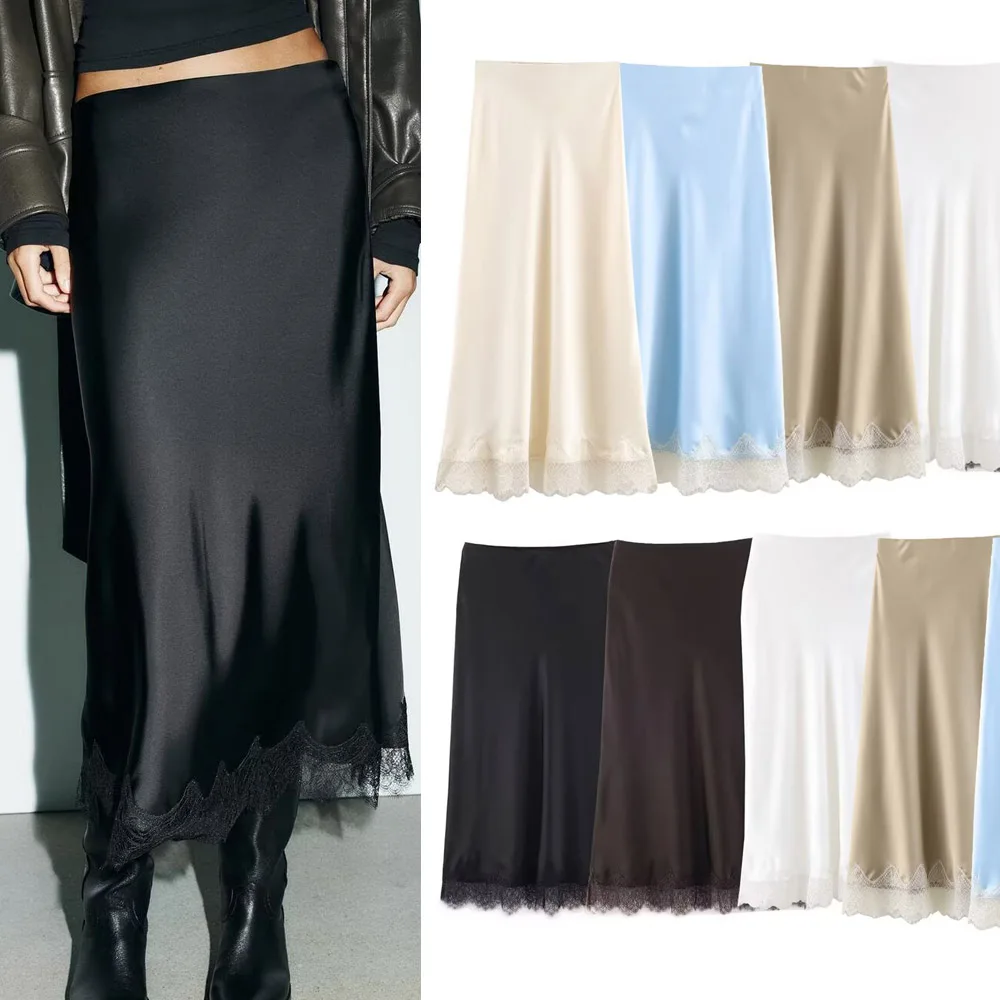 Femmes Satin dentelle demi-longueur jupe femme printemps été jupe Midi mode fille jupe...