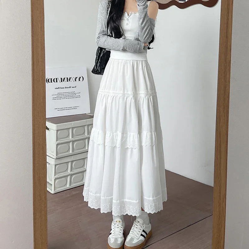 Coréen Chic dentelle Patchwork jupe longue femmes été taille haute une ligne bl...