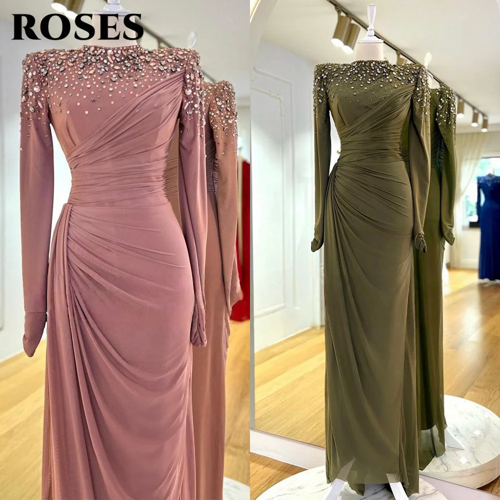 ROSES rose mousseline de soie col haut robes de bal froncé manches longues brillant strass ro...