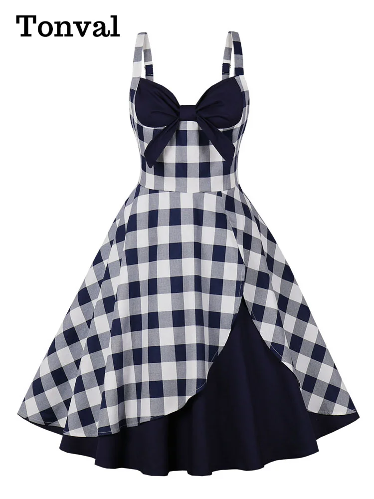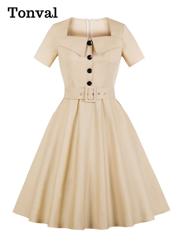 Tonval Pinup femmes col carré bouton avant ceinturé années 50 robe Rockabilly m...