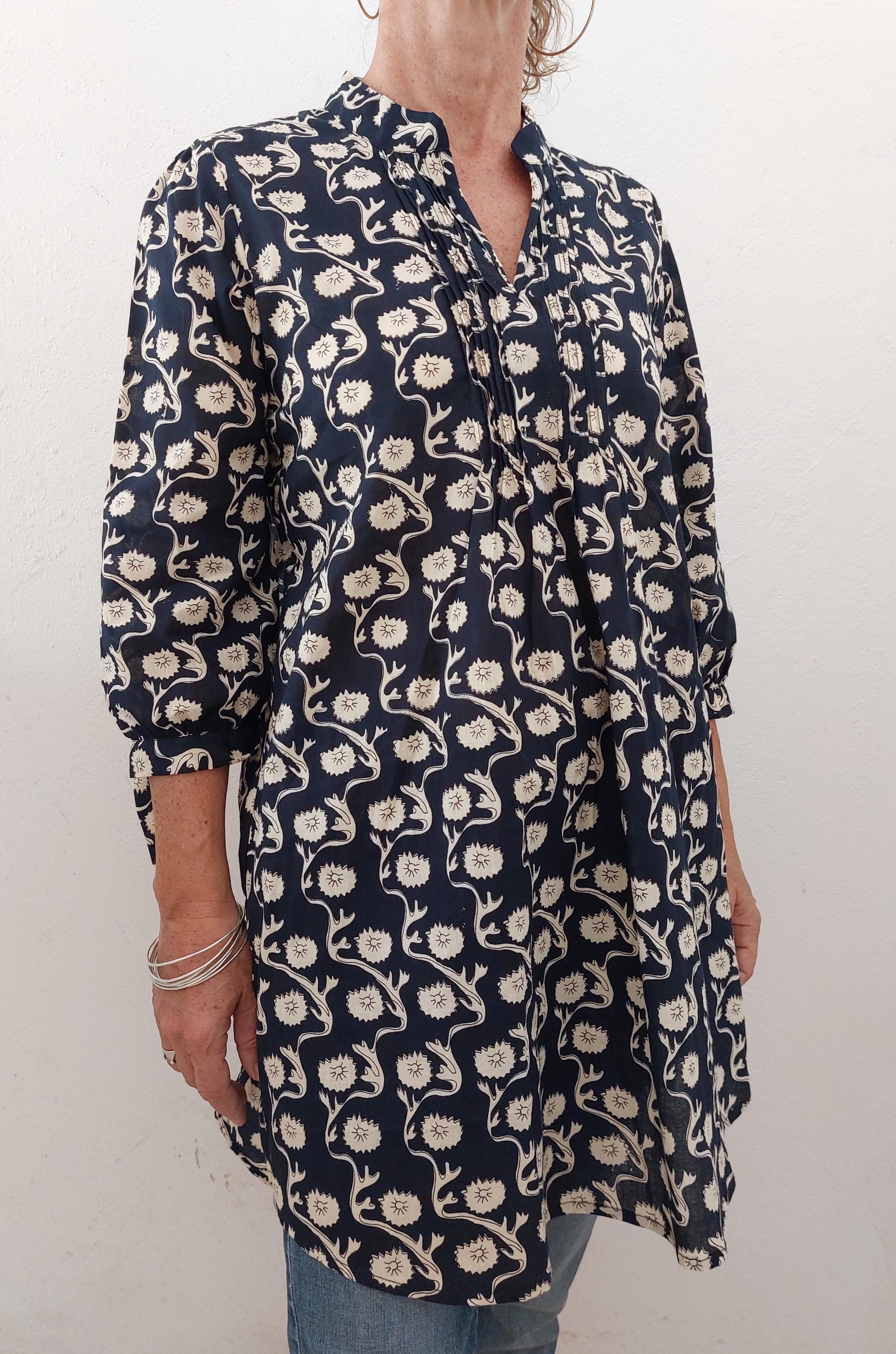 SIZES CHART ON LAST PHOTO Front pleat tunic in cotton 100% 3/4 sleeves Mandarin collar Side slit 17c...