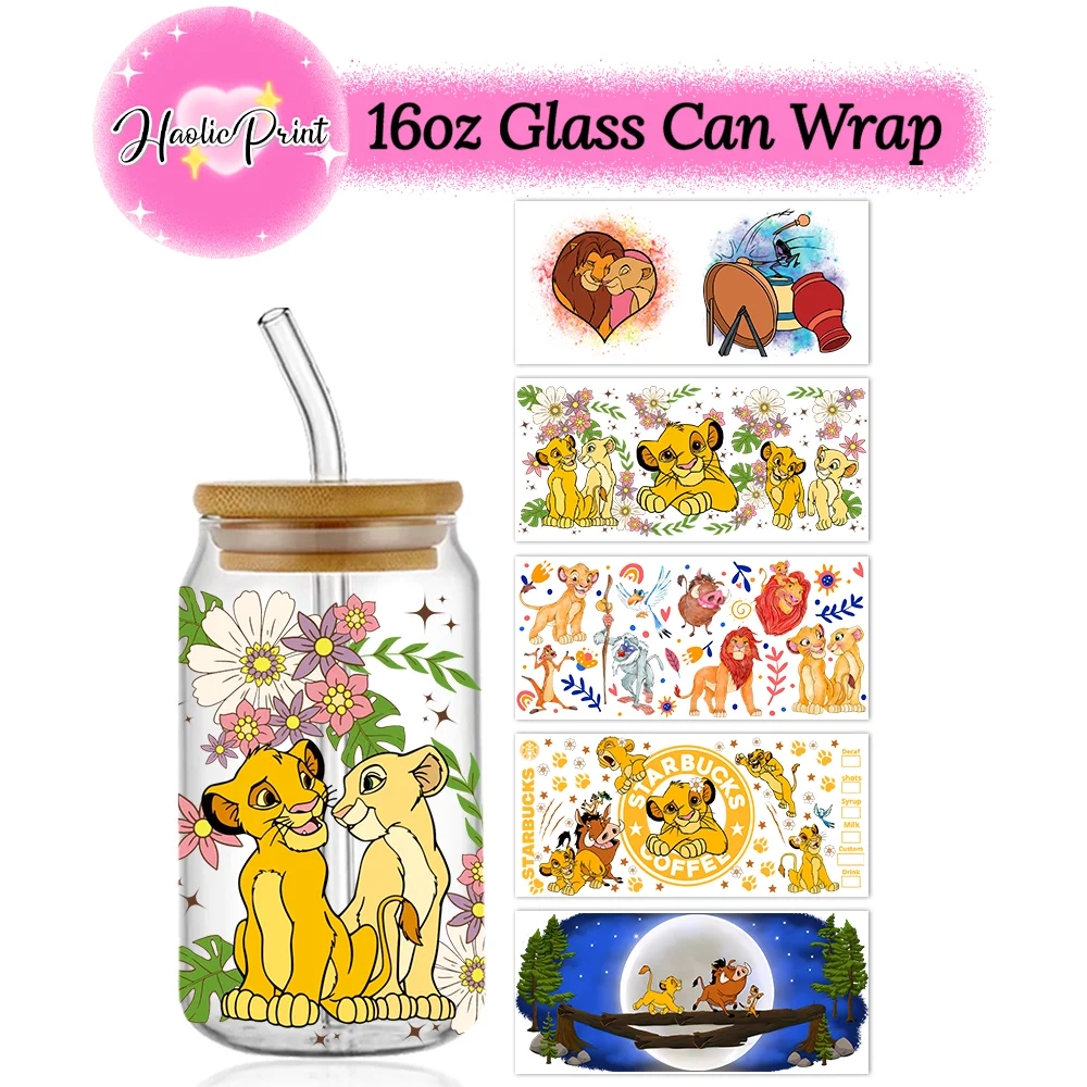 Enveloppement de tasse UV DTF avec personnages du roi Lion, verre Libbey de 16oz, gobelet à b...