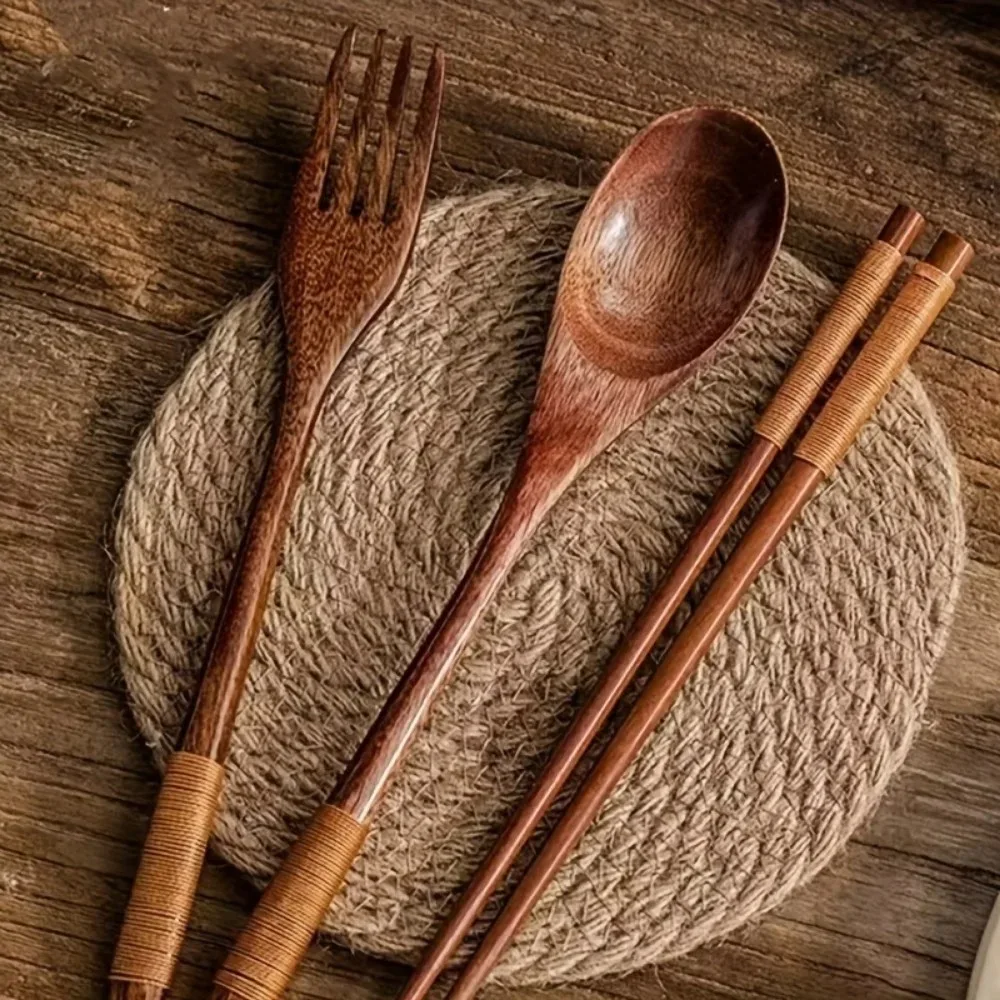 3 pièces/ensemble, vaisselle en bois, cuillère, fourchette, ensemble de baguettes, vai...