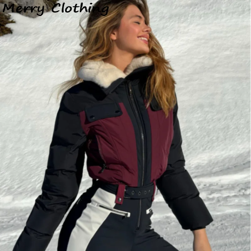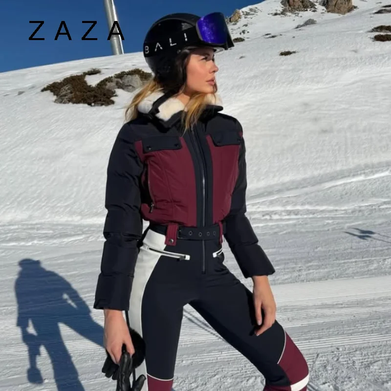 Combinaison de ski une pièce pour femme, col fourrure patchwork, fermeture éclair cont...
