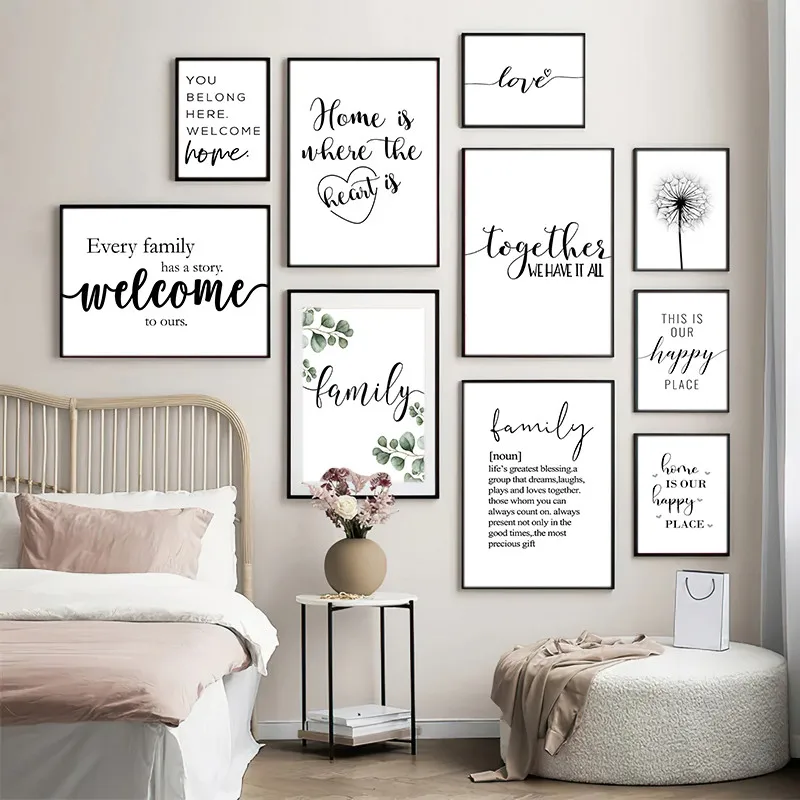 Affiches murales avec citation de famille heureuse, noir et blanc, ...
