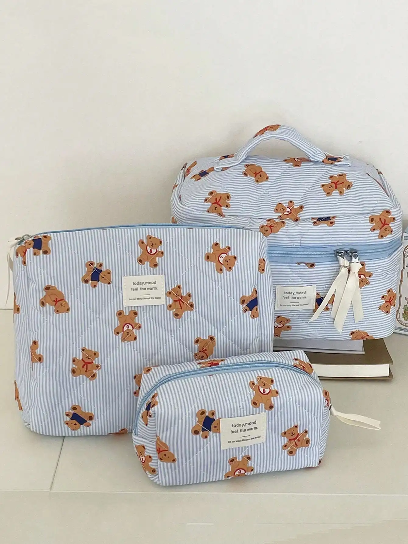 1 pièce/ensemble de trousse de maquillage matelassée ours rayé, trousse de maqu...
