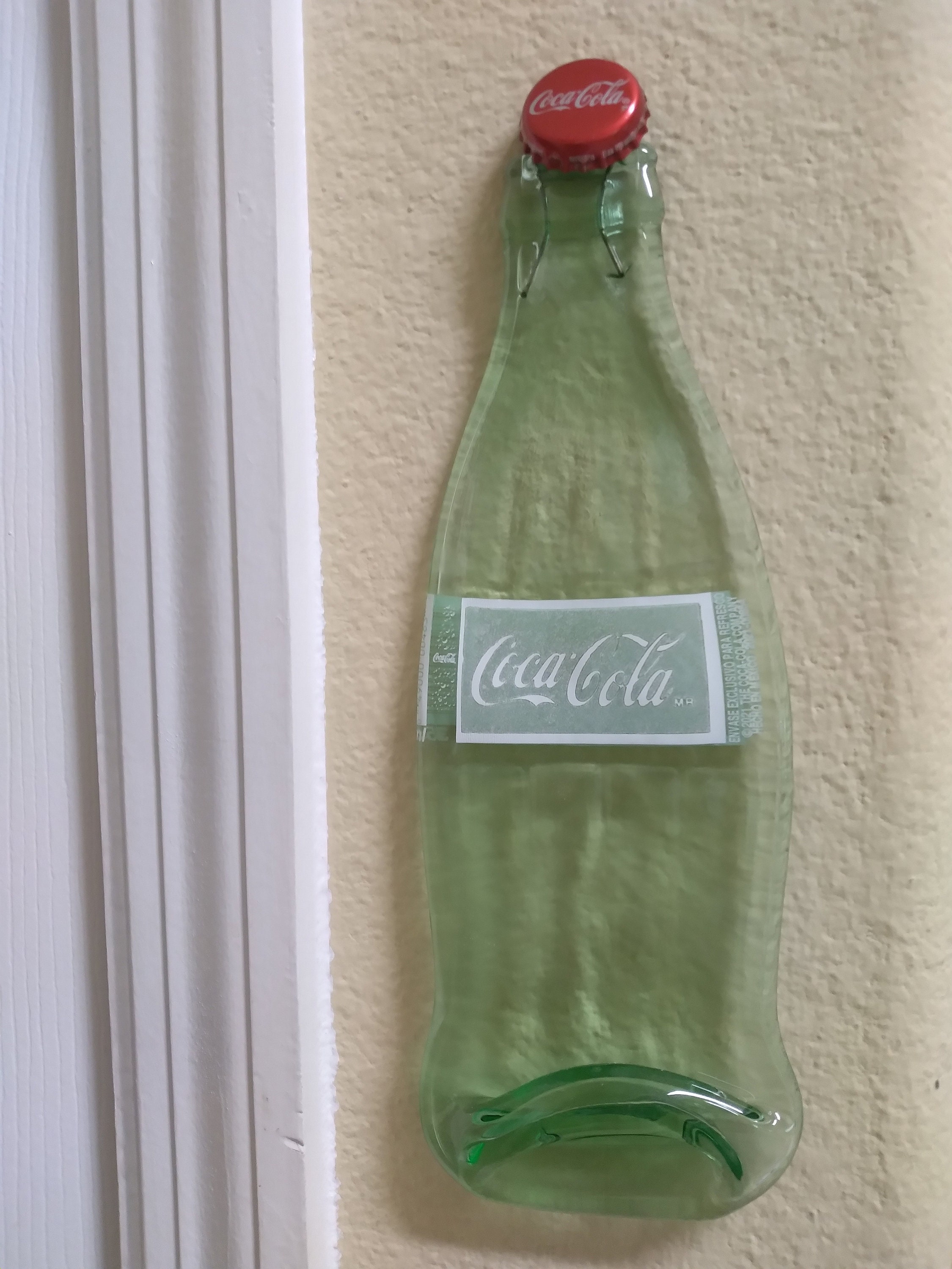 Art suspendu d'une bouteille de Coca-Cola affaissée / petite planche à découper...