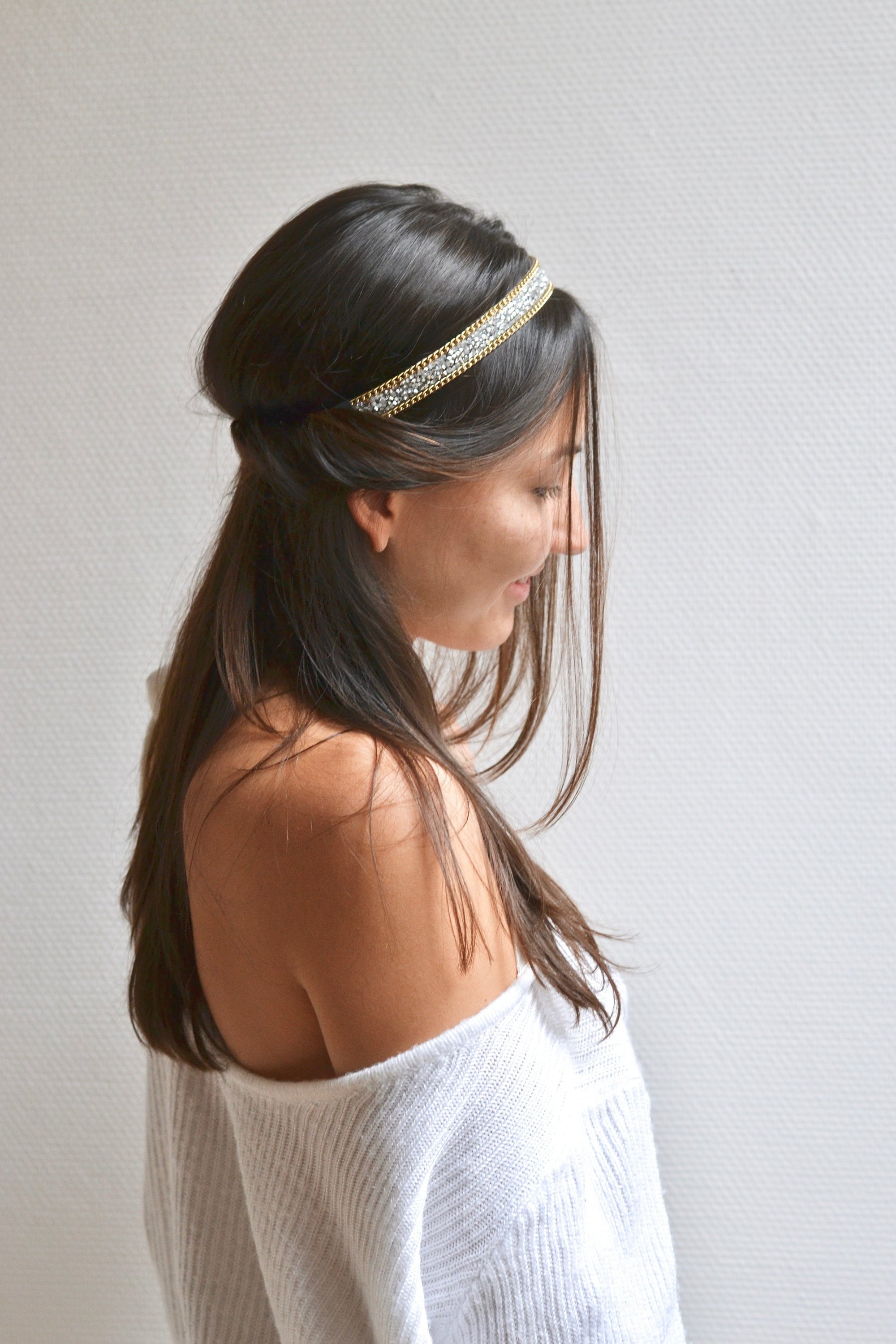 This magnificent headband was made with two gold-colored chains and small silver or black crystals (...