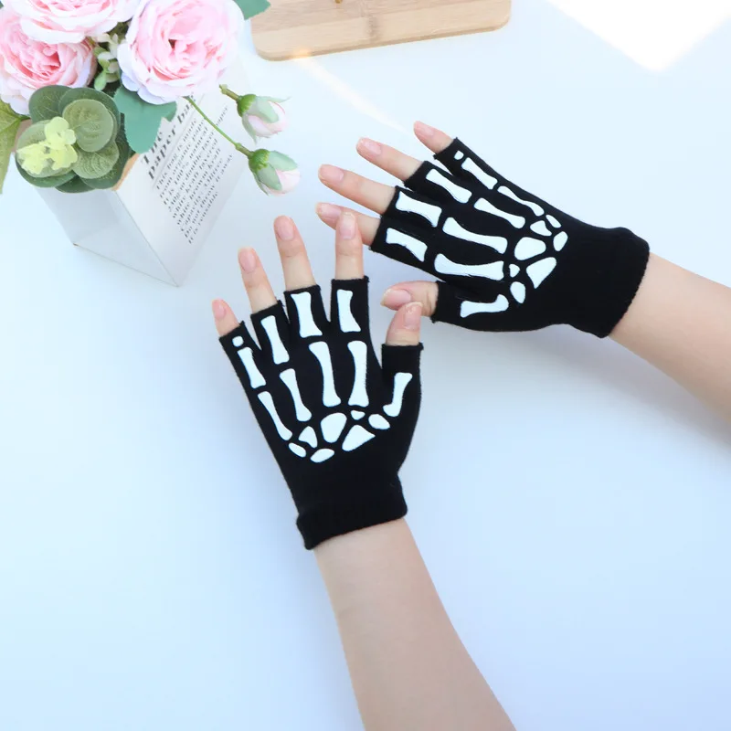 Halloween squelette crâne demi doigt lumineux sans doigts extensible tricoté gants cr&a...