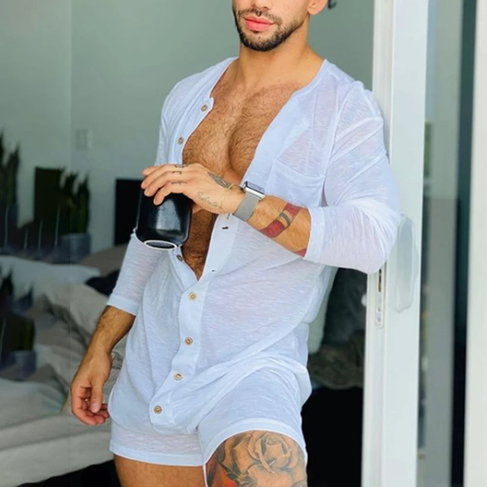 Combinaison moulante à manches longues pour hommes, couleur unie, Sexy, transparente, d&eacut...
