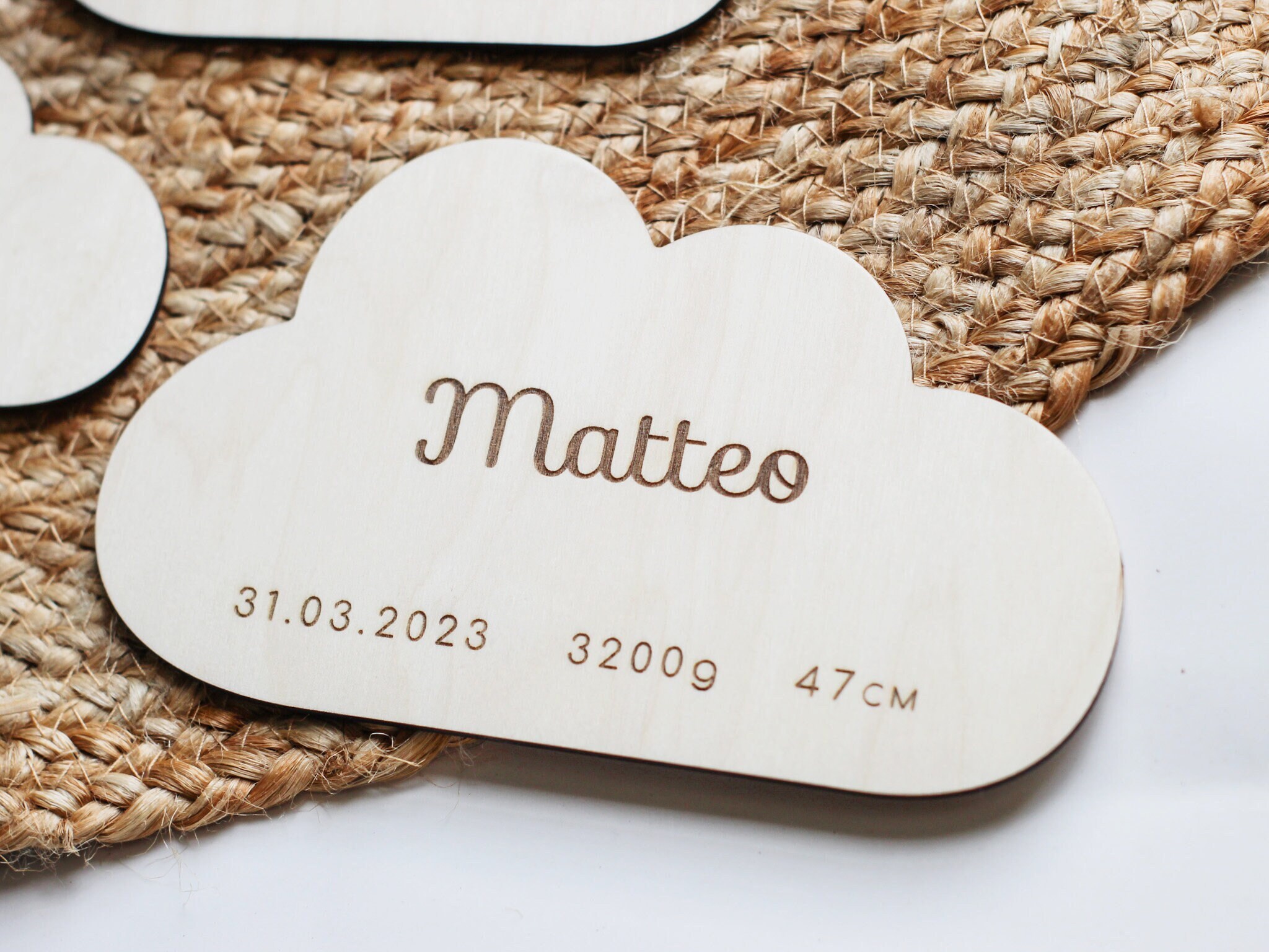 Nuage en bois, Plaque personnalisée prénom, Carte ann...